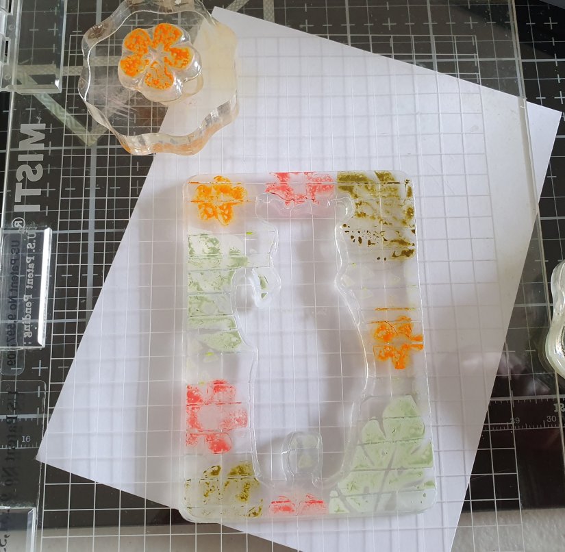 I inked up the different elements using a variety of Distress Oxide inks namely, Forest Moss, Peeled Paint & Twisted Citron for the leaves and Carved Pumpkin & Abandoned Coral for the flowers. I then stamped it down on the paper and got this wonderful watercolor effect. I cleaned off the stamp and then inked it up with Antique Linen Distress ink to fill it in.