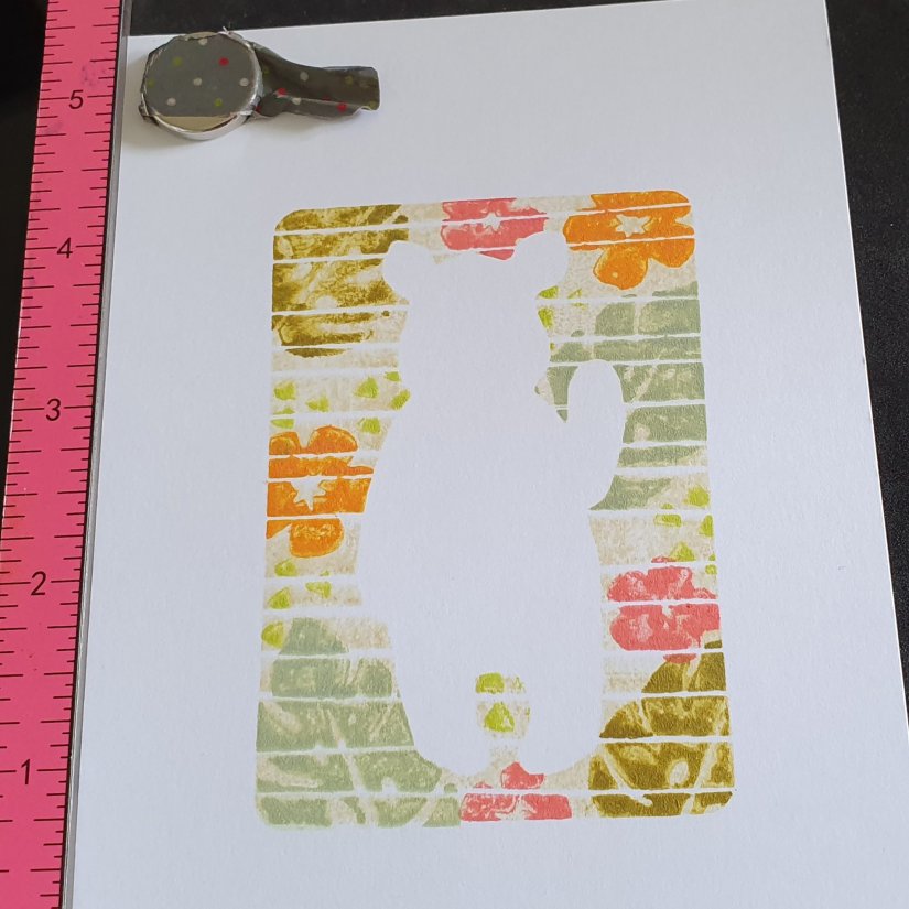 In the Hi There Bear stamp set, there is a small background stamp with stripes, I thought this would be perfect for the stamp on a stamp, otherwise called “stamp kissing” technique. For this technique I went with Distress Oxide Inks as they have both the qualities of a pigment and a dye ink. I used the Toucan Paradise stamp set leaves and flowers elements and stamp them directly onto the stripe background stamp. See photo below.