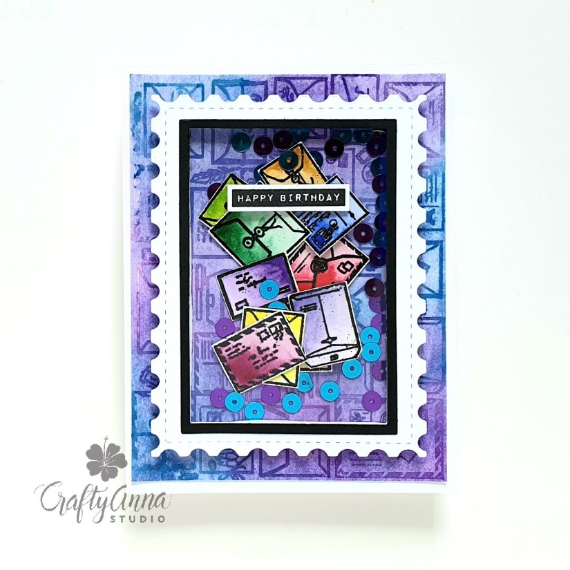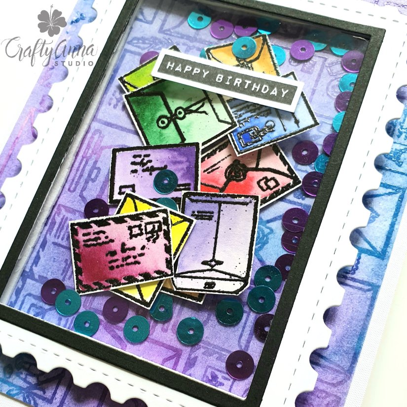 To assemble the card, I placed the cut out envelope images in the middle of the background, added coordinating sequins, then placed the stamp frame carefully on top, trapping the images and sequins inside.