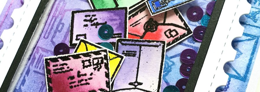 For this card, I used the Hero Arts Mail Jumble background cling stamp. The first thing I did was stamp it on some watercolor cardstock with versamark ink then used black embossing powder. After I heat set it, I proceeded to watercolor the different envelope images in rainbow colors. I then fussy cut out each image to use as a shaker element.