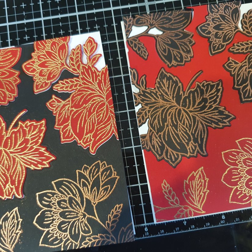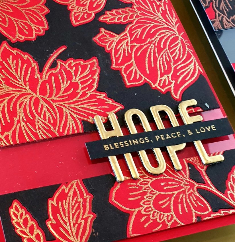 I took black cardstock and created my own background pattern using the Ornate Foliage stamp set. I used a MISTI stamping platform so I could create several cards at one time. For the red cardstock, I used the Altenew Antique Gold Embossing powder and on the black cardstock, the Rose Gold Embossing powder.