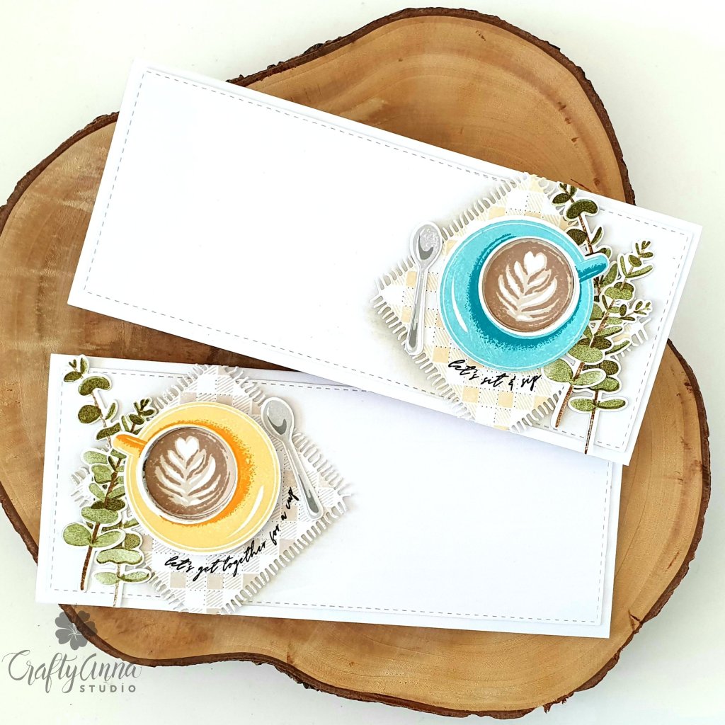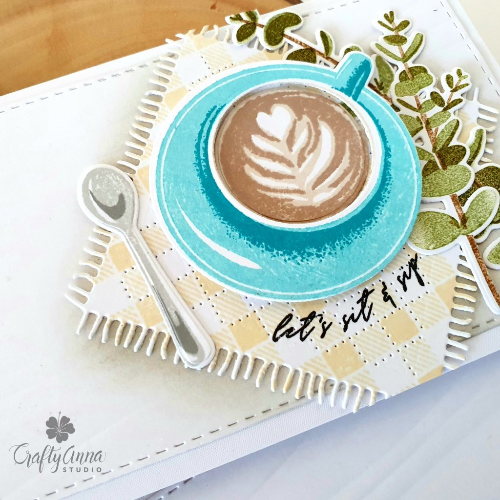 Hi Elaine! I would love to share those with you. For the coffee cups, I used Altenew Inks – Sunray & Snapdragon for the yellow cup. Dewdrop & Teal Cave for the blue cup and Sand Dunes & Mocha for the coffee. Silver lake & Cloudy Night for the spoons. For the Eucalyptus leaves I used Distress Oxide Inks in Bundled Sage and Peeled Paint.