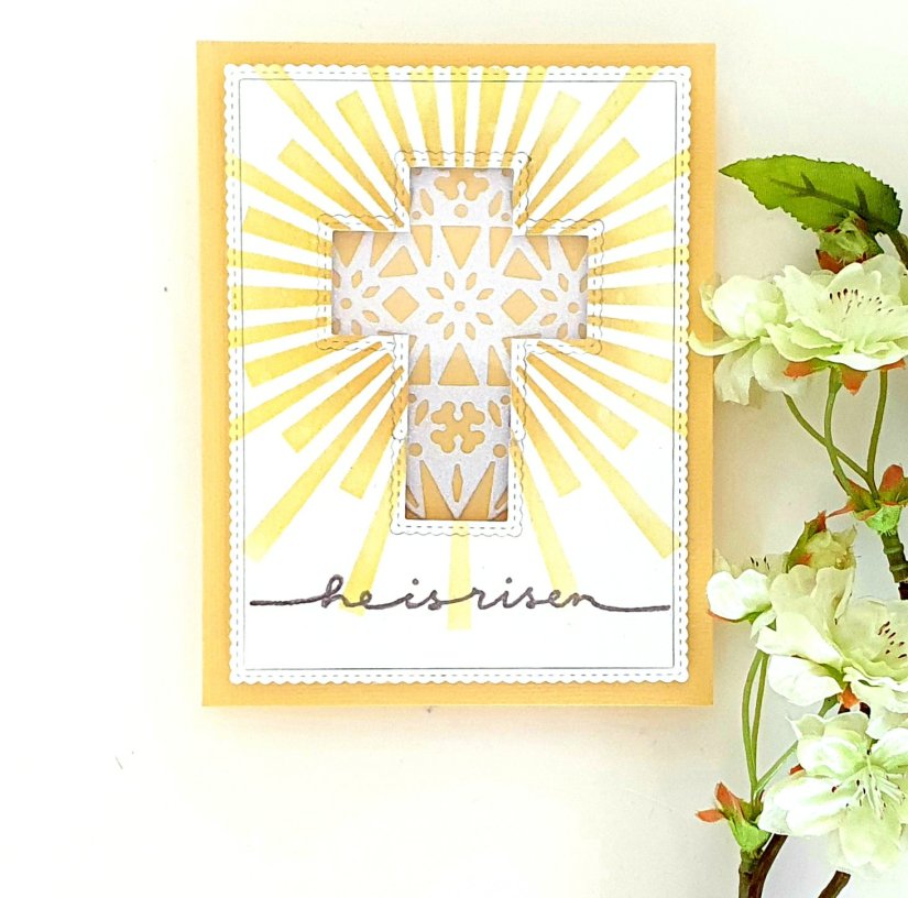 I die cut the Extravagant Egg cover die out of Brutus Monroe Fallen Snow Glitter Cardstock. Then positioned it in such a way that the design appeared symetrical thru the cross die cut window. I placed clear acetate behind the cross window and placed craft foam behind it before attaching it to a matching yellow card base. If you would like to see what else I created using this egg die, please click on this link here.