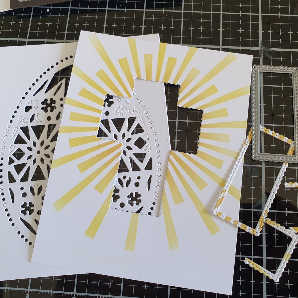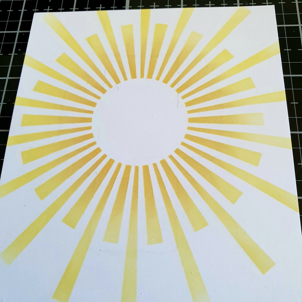 Then I used the Burst stencil by Brutus Monroe and ink blended it with three colors of Distress Oxide Inks starting with Wild Honey, then Scattered Straw and for the outer edges, Squeezed Lemonade.