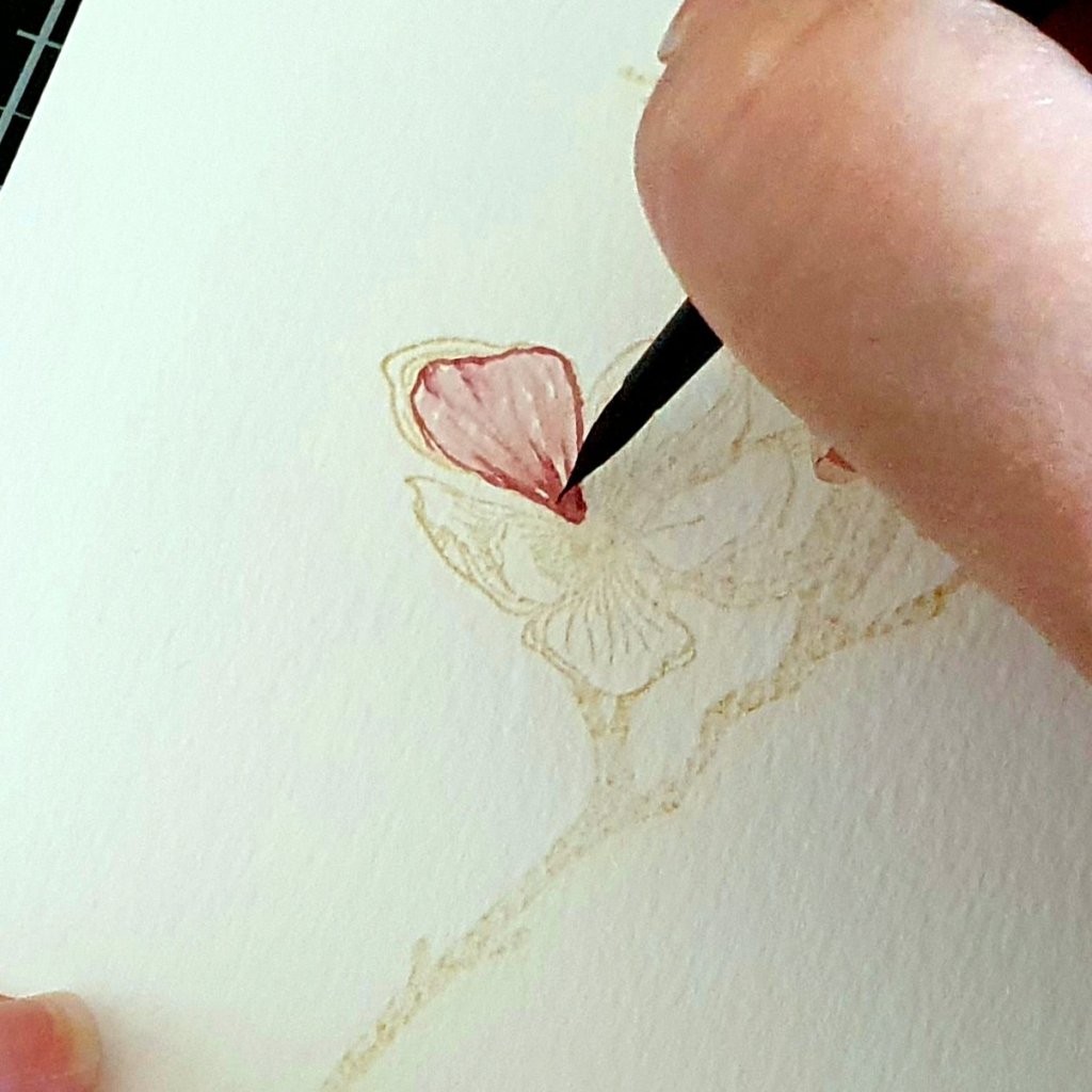 Then I took a No. 4 Silver Black Velvet Round brush and proceeded to outline the flowers with the pink pigment with just the tip of the brush touching the paper.