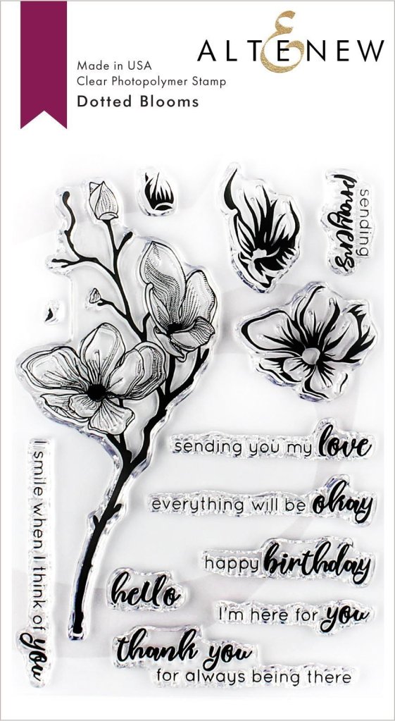 Since I do not sketch very well, I thought of picking a floral stamp set that had the most realistic drawing of a flower. Botanical illustrations usually depict the whole flower in clusters with the branch and leaves included. I picked a beautiful floral stamp from Altenew, Dotted Blooms stamp set. I chose this because it had a lot of detail to it that I could follow along in my watercoloring.