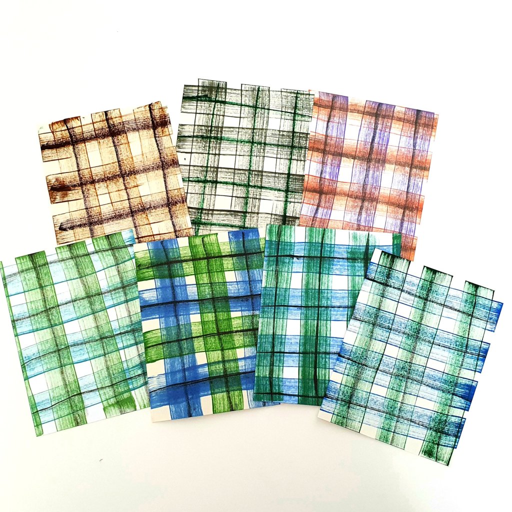 I did this with a variety of colors of inks. These are all the backgrounds I had made after my 15 minutes swiping session. I love the rustic look and the uneveness of the pattern. It almost looks like real plaid fabric. If you like to have the pattern more even, you can probably use a ruler to “guide” your ink pad as you swipe it across the paper. I like mine uneven for a more organic feel.