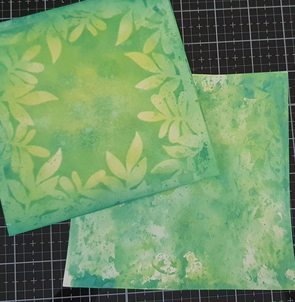 For the background, I ink blended three colors of Distress Oxide inks ( Twisted Citron, Lucky Clover, Evergreen Bough )on a 6×6 watercolor paper. The concentrated the blending of lighter green in the middle working outward with the darker green. After I was satisfied with my inkblending, I took off the stencil, I spritzed the stencil generously with water and put it down on another panel of watercolor transferring the residual ink. On the main ink blended panel, I used a finger dauber and dabbed little circles of different greens in the middle creating a bokeh effect. I inkblended more color on the sides, splattered it with paint and called that panel finished. I also used some left over inks to smoosh into another panel which I will save for another project.