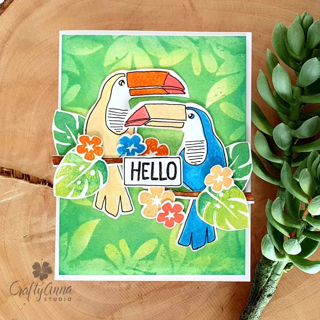 She chose this cute Toucan Paradise stamp set from Concord & 9th. Then I dug through my stencils and picked an old stencil from Simon Says Stamp called Leafy Frames, which I’ve never used as well!