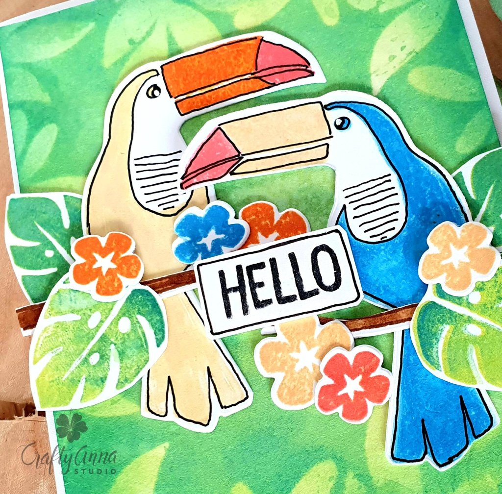 Brilliant card, Anna! Using the gelli press for mirroring the toucan is so clever. They look great against that stenciled background.