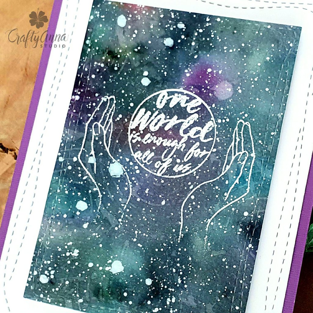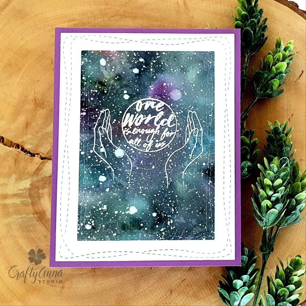 My first card uses a sentiment from the My Monthly Hero December 2019 kit. I chose the sentiment “One World is Enough For All of Us” which I found quite fitting for this blog hop.