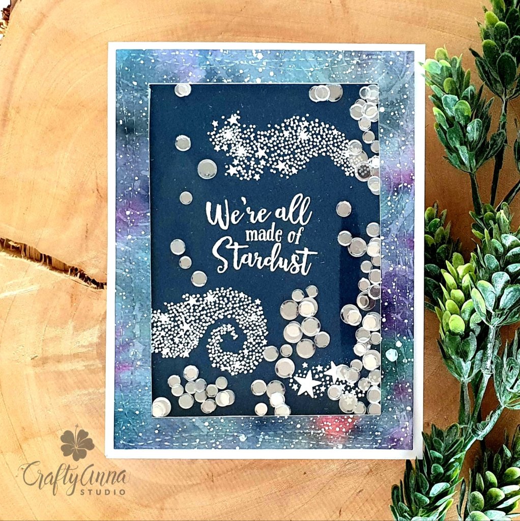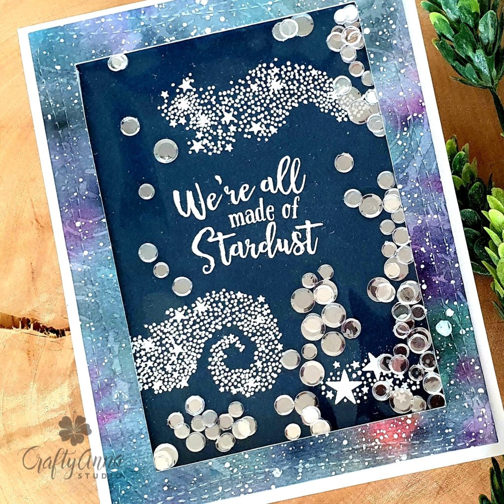 For my second card, I used an older MMH kit from August 2017. I decided to make it a shaker card using the left over galaxy frame from the first card. I also white heat embossed the sentiment ” We’re all made of Stardust” along with the swirls of stardust. I used clear flat sequins for the shaker element.