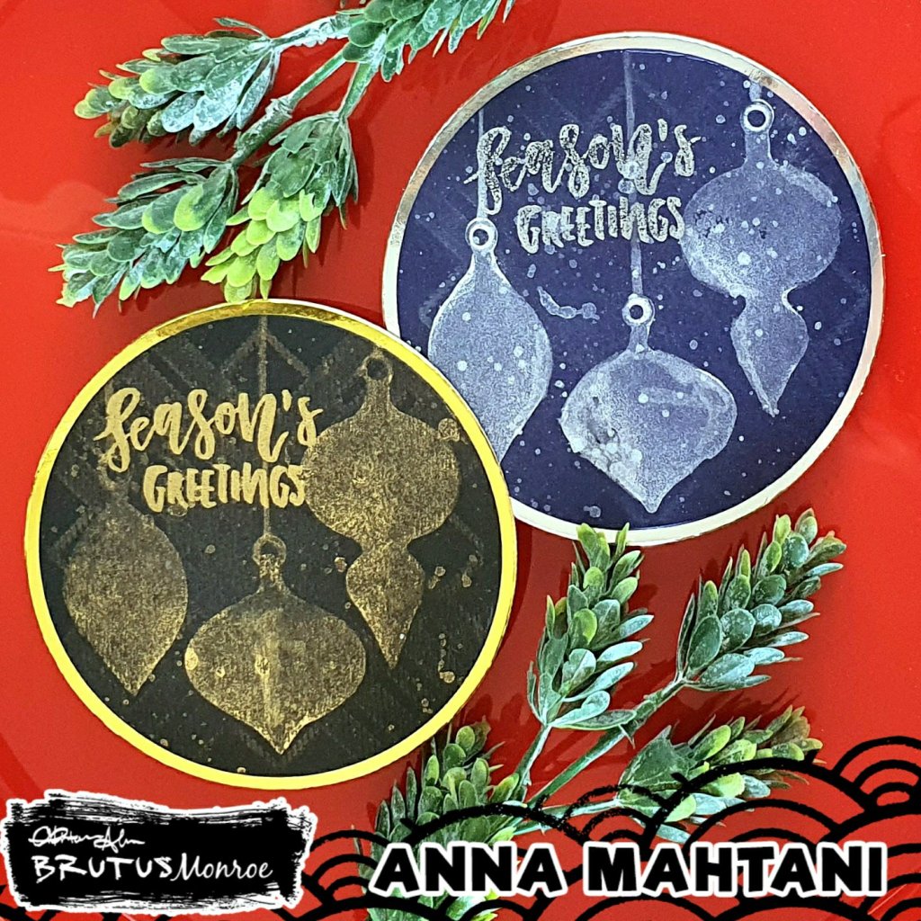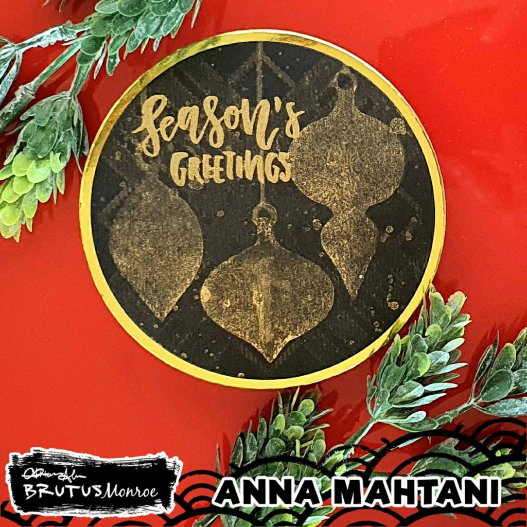 I took the “Seasons Greetings” sentiment from the Falliday stamp set and heat embossed it onto the image using Sterling Embossing Powder. I just love how all of Brutus Monroe’s Metallics all coordinate together!