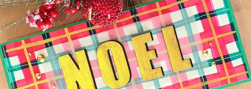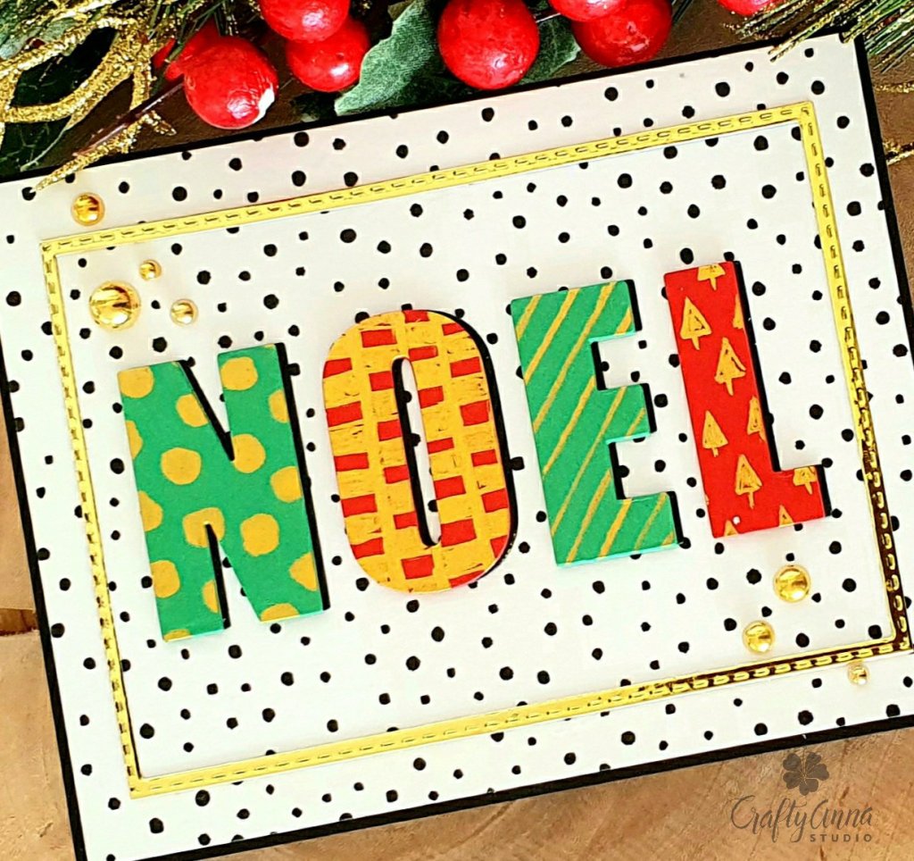 I painted patterns on red and green cardstock using the same gold paint. Then I die cut them using the same Caps Bolda Alpha die set. I die cut additonal letters from black cardstock to give the letters shadow and dimension.