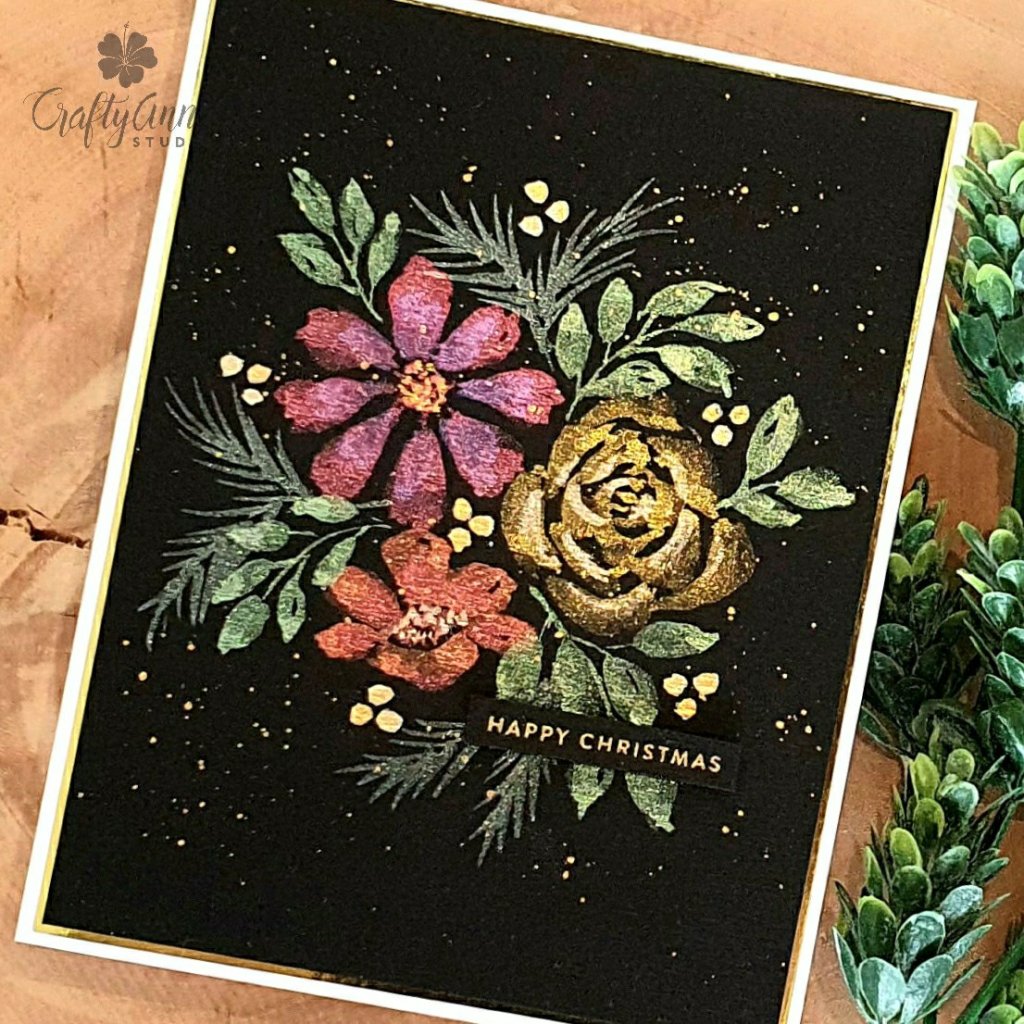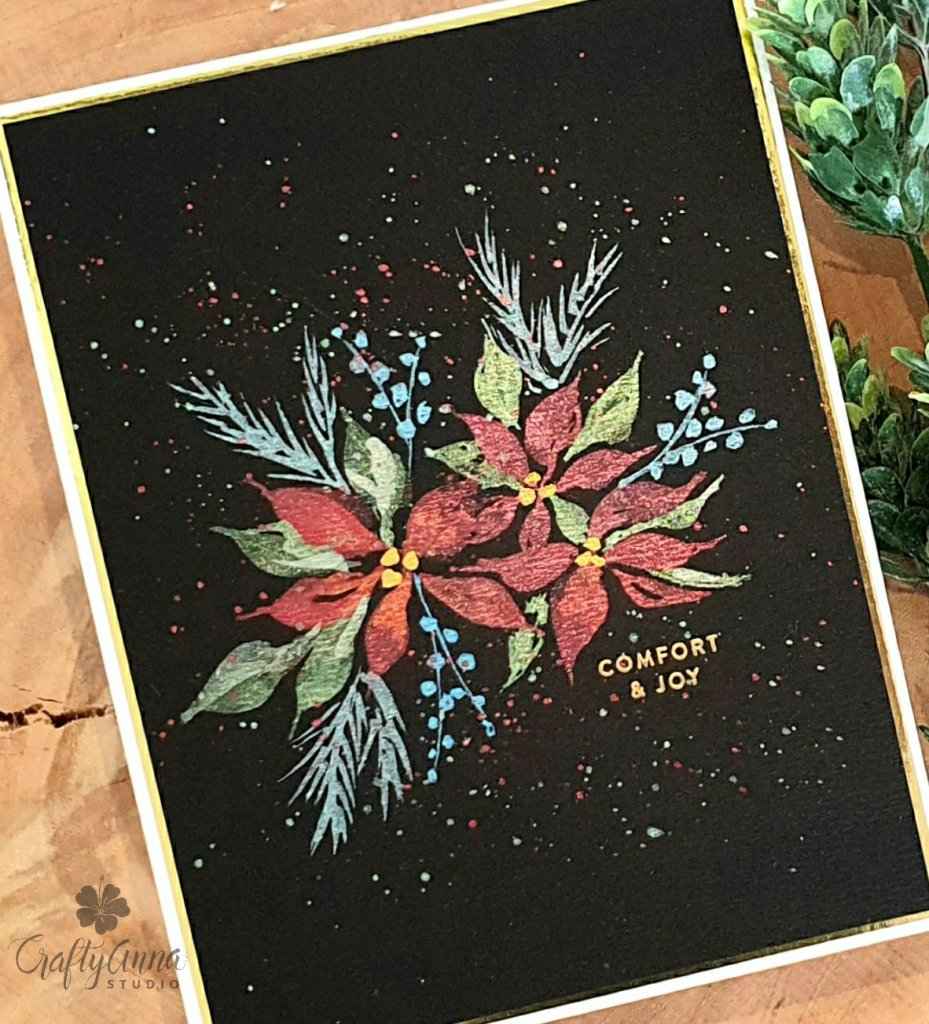 For this card, I used the Altenew Metallic Watercolor pan set and did some loose watercolor flowers on black cardstock. I really loved the effect! I wish the photos did it justice! The sentiment is from the Simon Says Stamp Tiny Words Christmas stamp set, gold heat embossed on black cardstock.