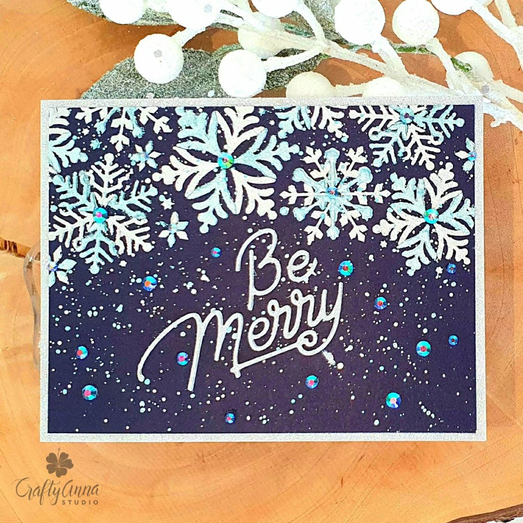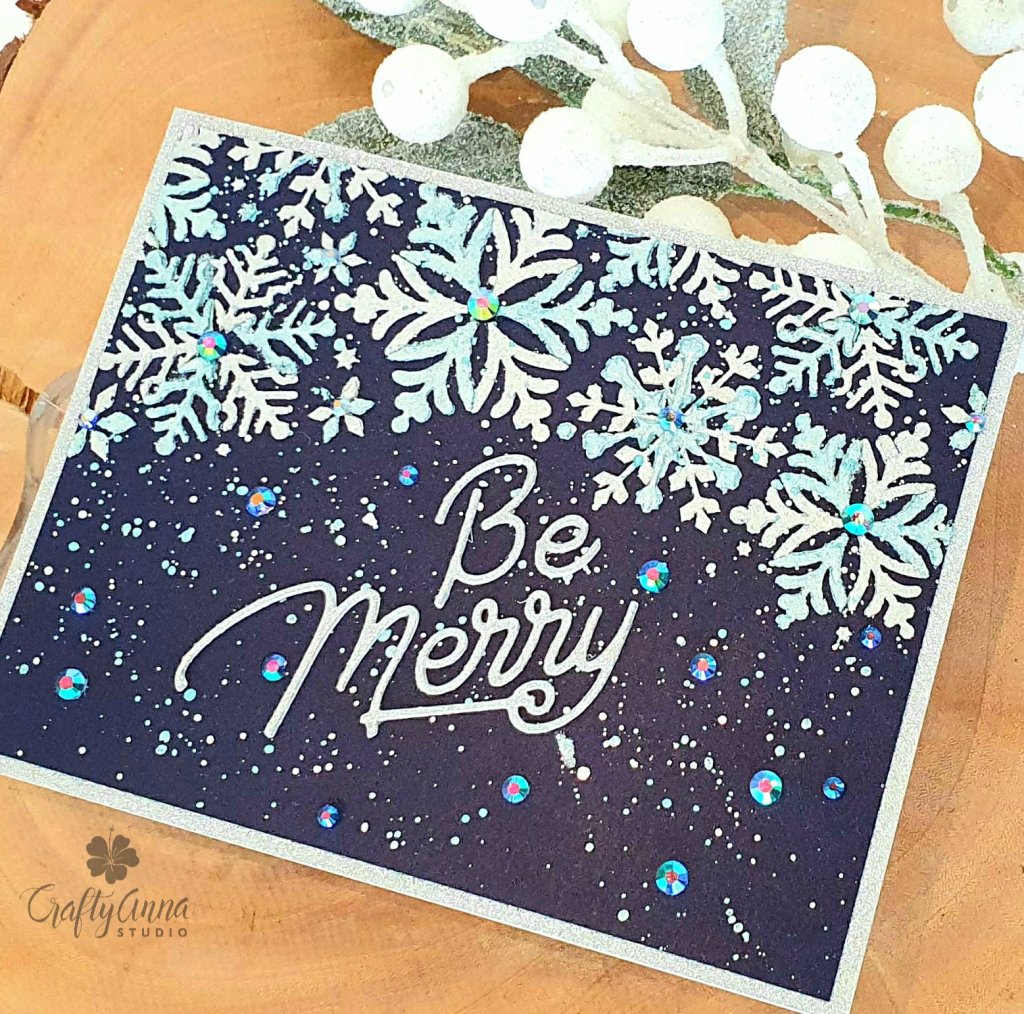 For this card, I used the Snowflake Soiree stencils from The Greetery. They are not layering stencils per se, but more of a builder stencil where you can use the four stencils (A1, A2, B1 & B2) to create different colored snowflakes.
