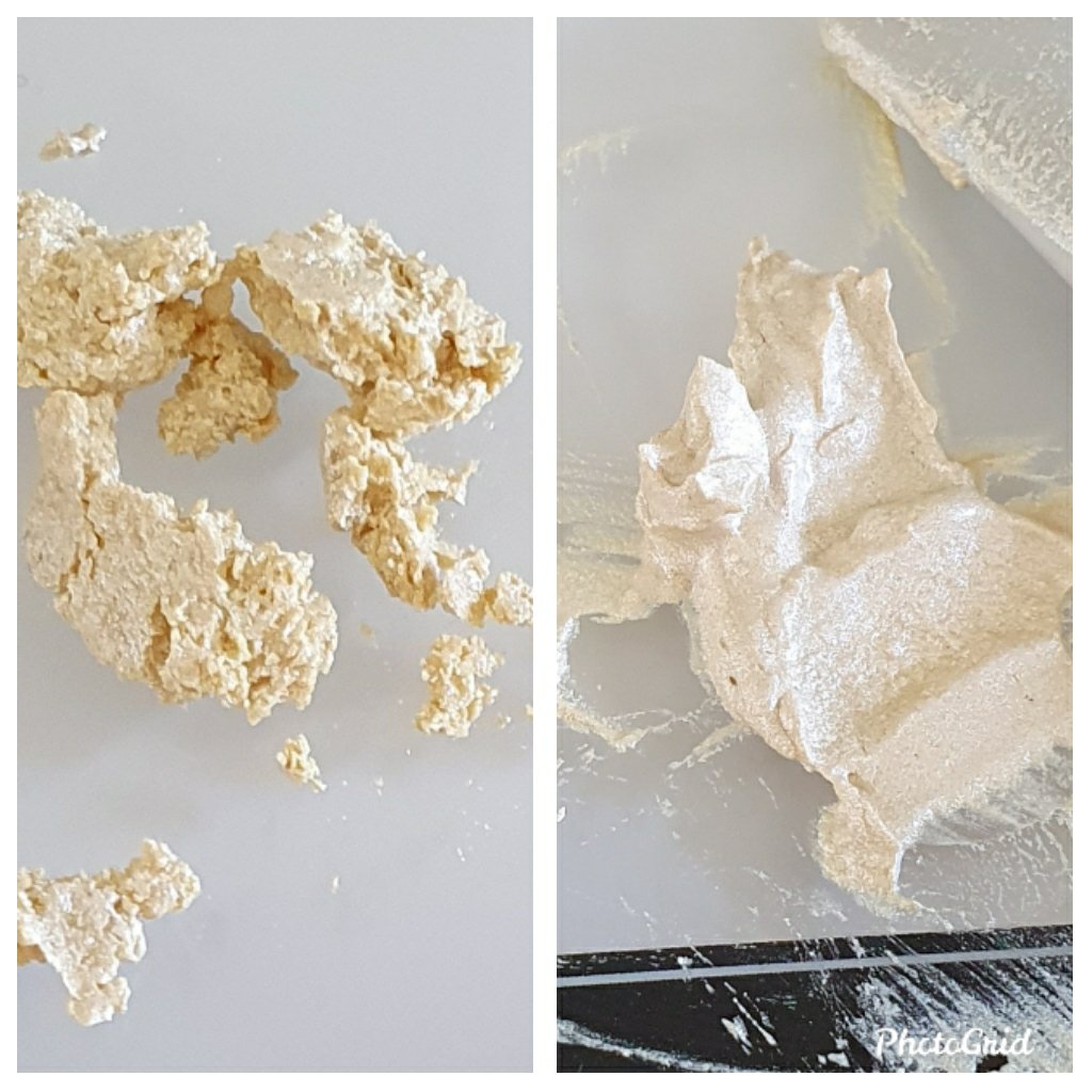 I took my palette knife scooped up the crumbly mousse onto my glass mat. I added a few drops of water onto the mousse and worked at it with my craft knife to achieve the right consistency as I remembered it to be – too thick and it would be hard to spread – too thin, it would seep under the stencil. Here are the photos before and after.
