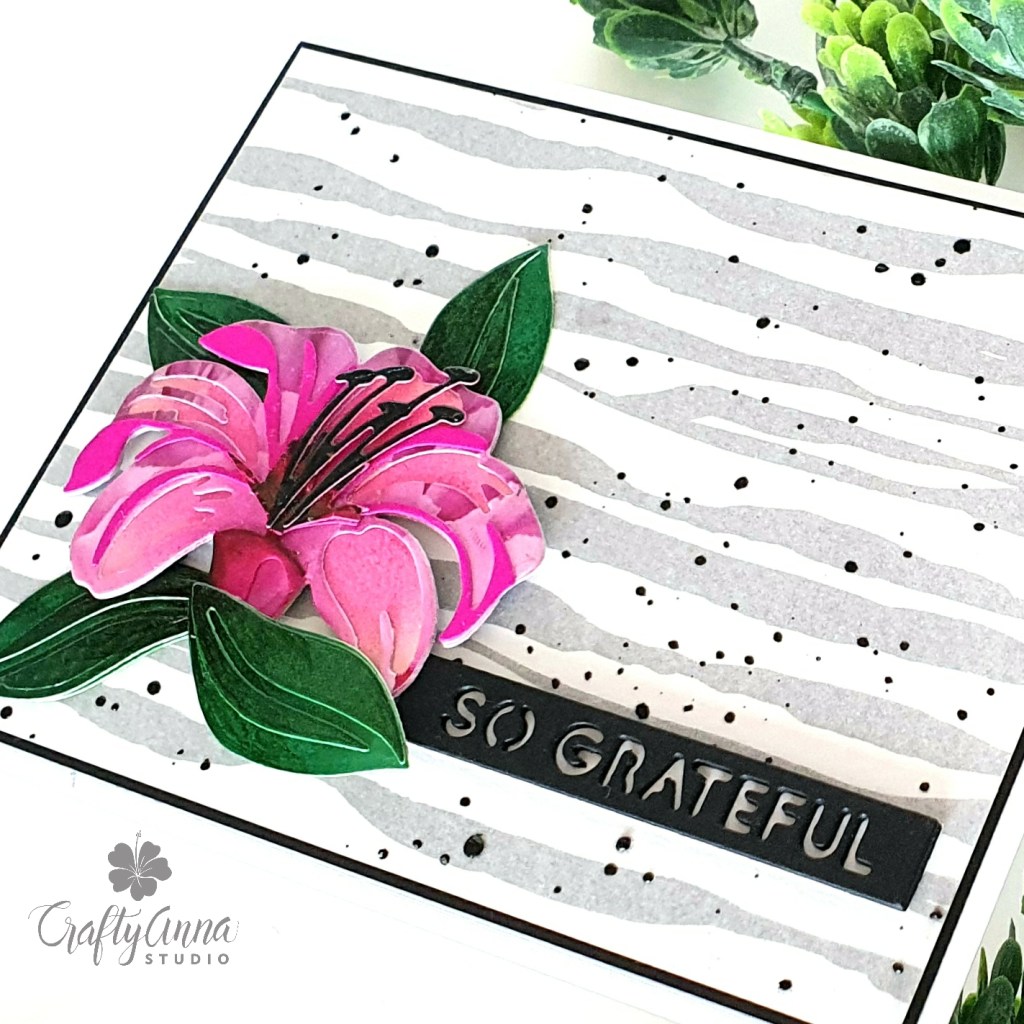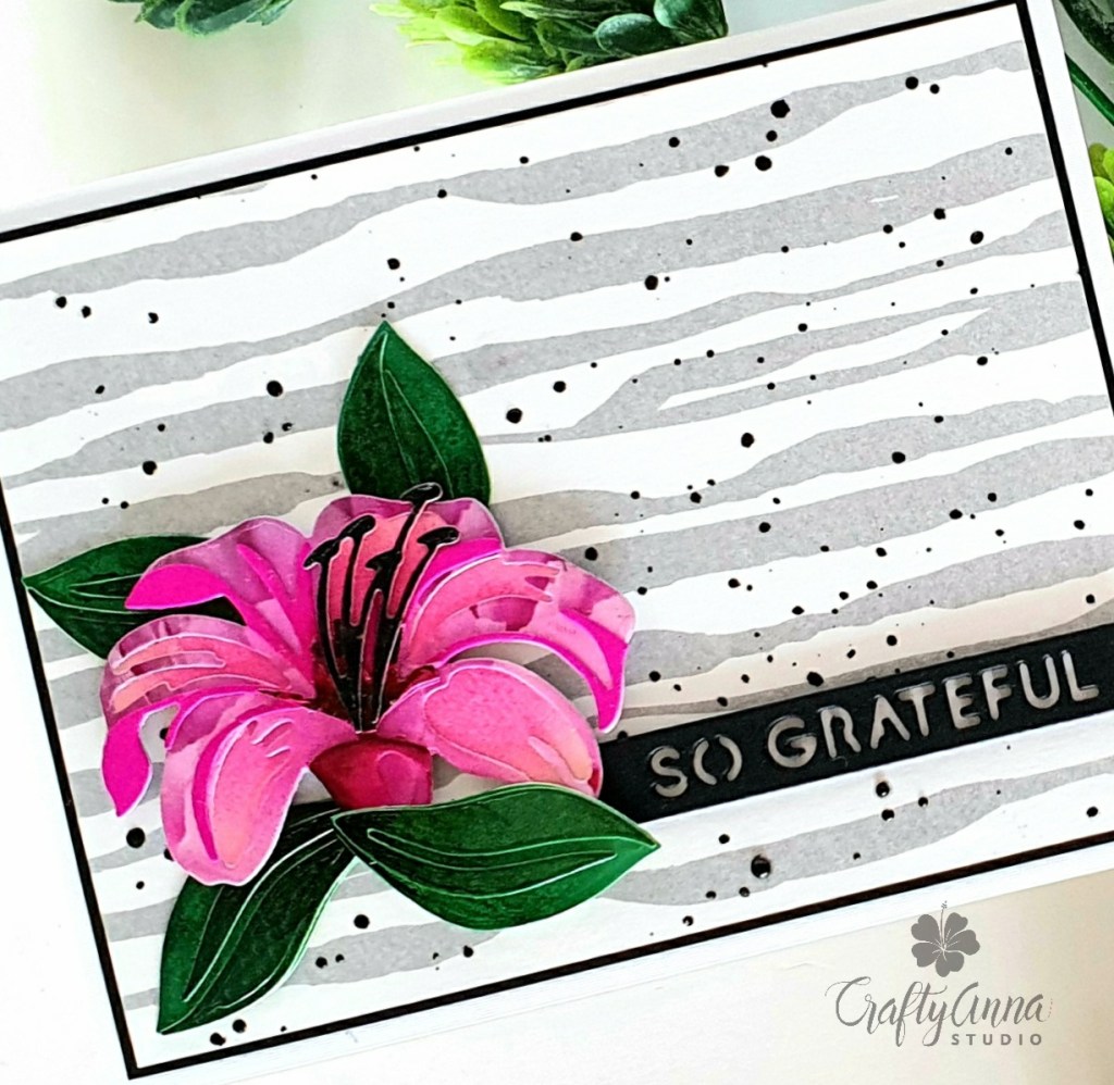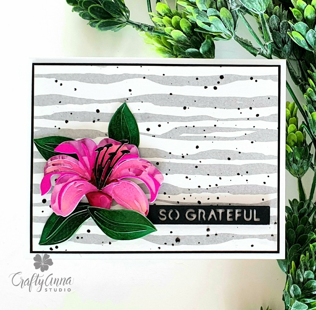 I adhered the layering lily on the lower left hand side on the card panel using foam tape, doubling up the foam tape in some areas for additional dimension. I added “So Grateful” sentiment from the beautiful Essential Sentiments Strips Die set cut from Jet Black cardstock. Here is another photo of my finished card.