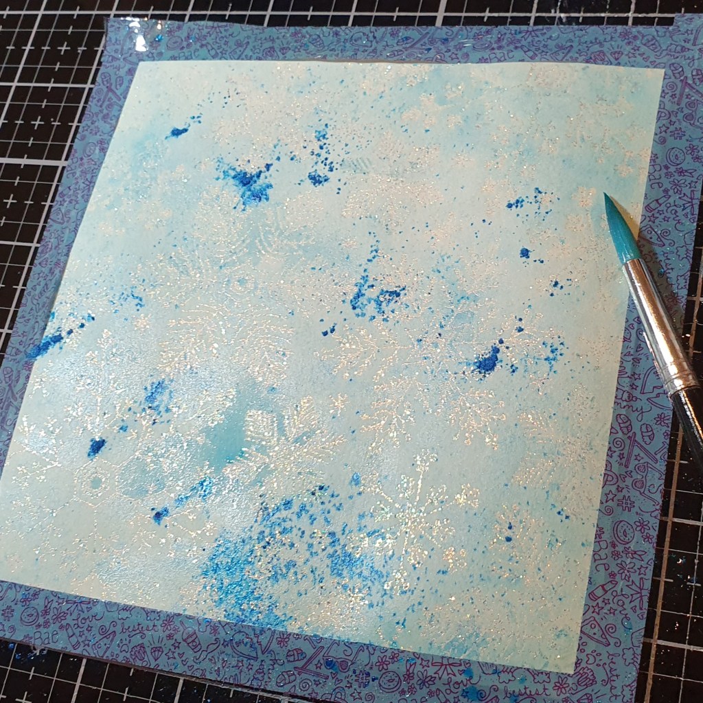 I took the embossed panel and taped it down on all sides on my craft mat with washi tape. I sprayed the panel with water then sprinkled Blue Blitz Nuvo shimmer powder.