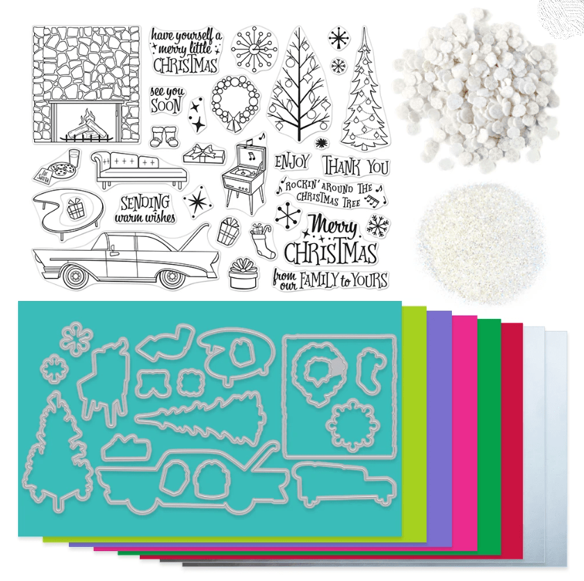 I stamped out the car and gift images from the October 2019 Hero Arts My Monthly Hero Kit with Memento Black Ink and colored them with Copics. I love the mid-century inspired design of this kit, which, by the way, is still available for purchase!