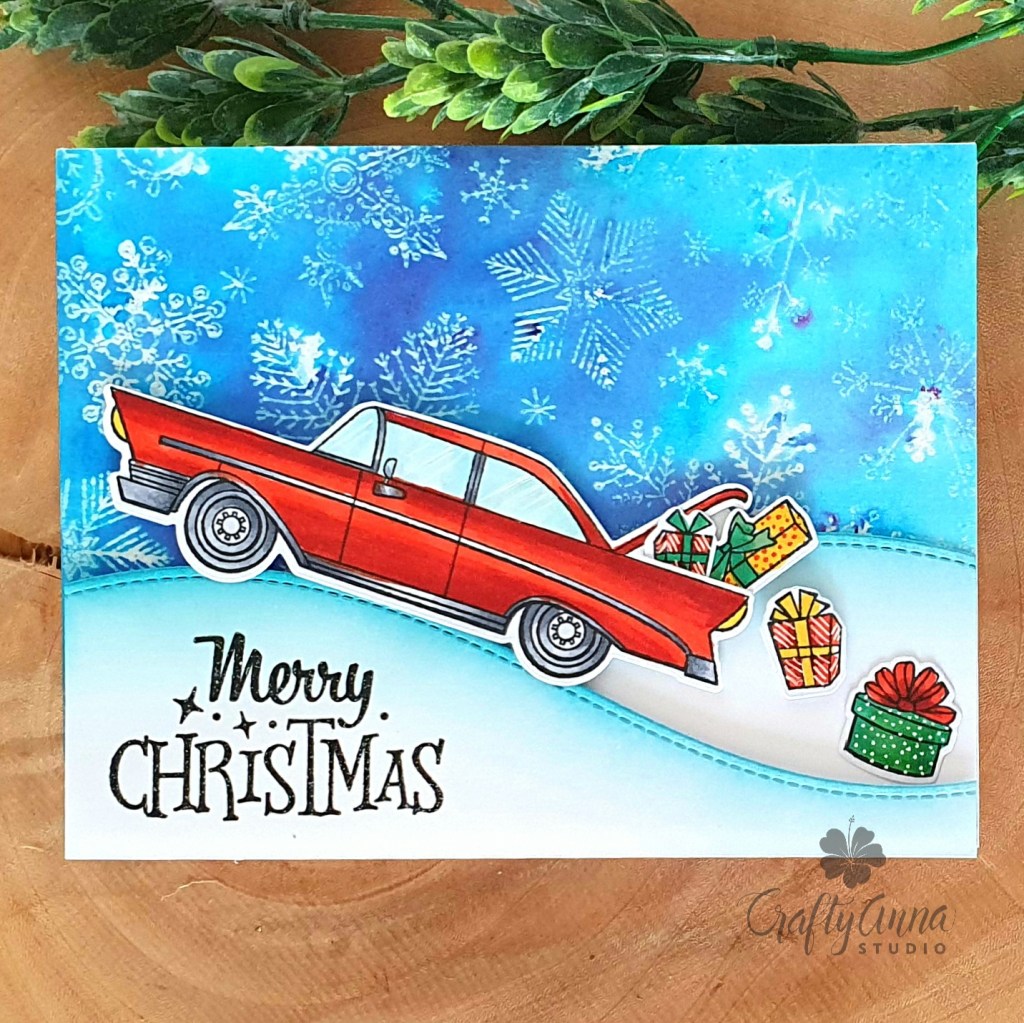 Beautiful Anna! I love how the gifts are falling out of the trunk! They must be in a hurry to get to Grandma’s house! 😆😆😆