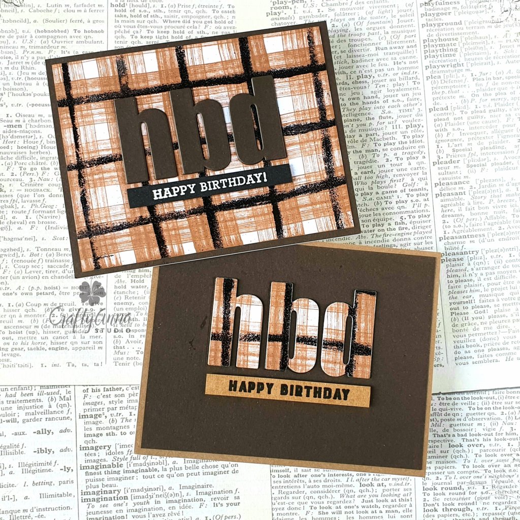 I cut down the the plaid background to 4″X5.25″ and adhered it to a coordinating plain card base. Before I in-laid the letters, I die-cut two extra sets of letters from scrap cardstock and inlaid them. Then I added a sentiment “Happy Birthday” across the bottom.
