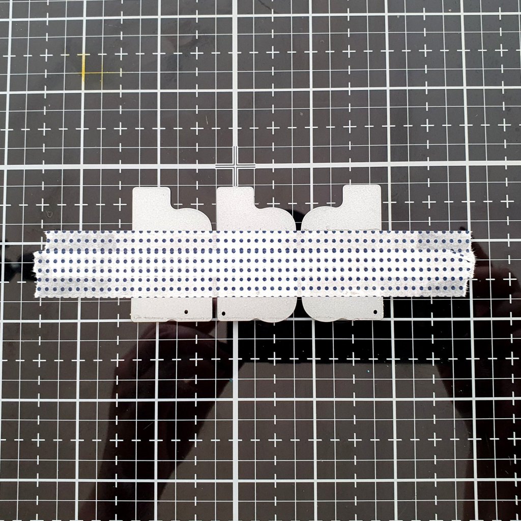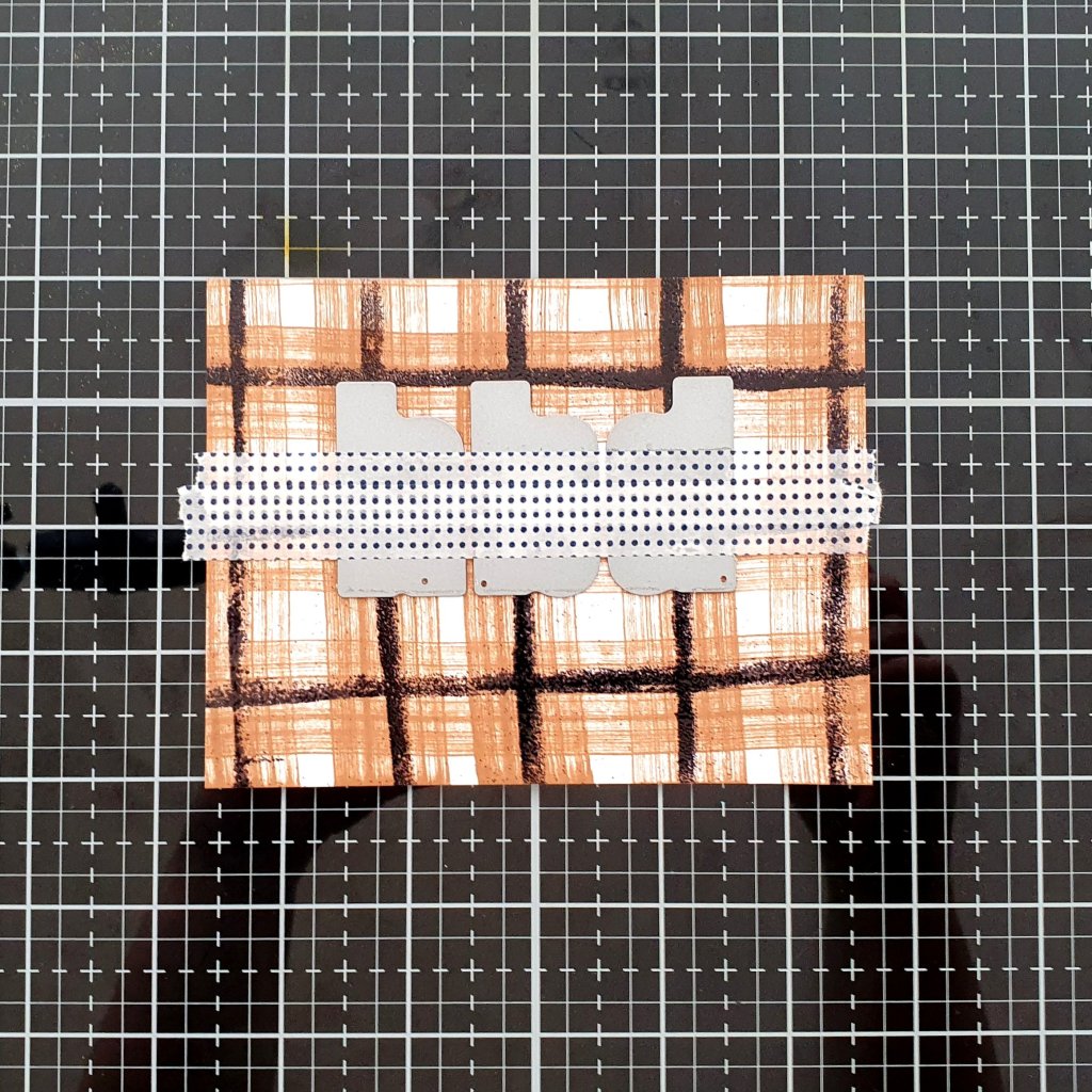 I took the dies and lined them up on the grid of my glass mat. I spaced them out evenly and used the lines on the grid mat to align them. When I was satisfied with the alignment, I took a couple of strips of washi and placed them on top of the dies. This held them together.