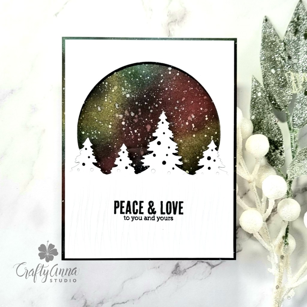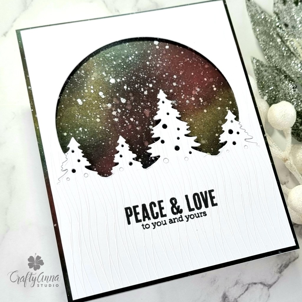 For my final card, I used the Galaxy background I ink blended with Distress Oxide – Salty Ocean, Mustard Seed & Festive Berries. I also used Black Soot distress Oxide. I used one of my favorite dies, the Hero Arts tri-fold Winter Pine to do some partial die cutting along with one of the round dies from the Round Infinity die set.