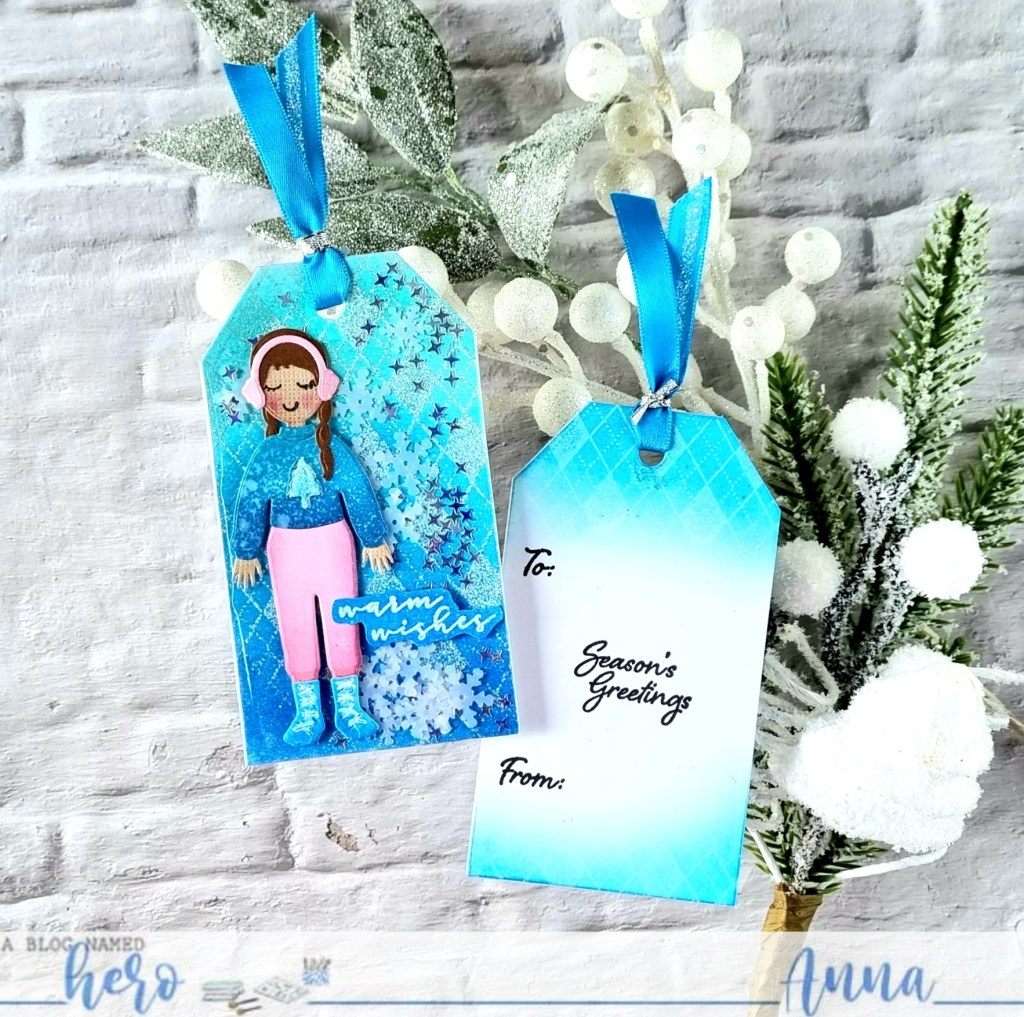Hi everyone! I’m back with a mid-month inspiration for our A Blog Named Hero challenge. Our theme this month is Glitz! My project today is inspired by a recent class I took at Holiday Workshop over at Online Card Classes where the talented Caly Person taught us how to make an infinity shaker card. I took that idea and decided to make an infinity shaker tag!
