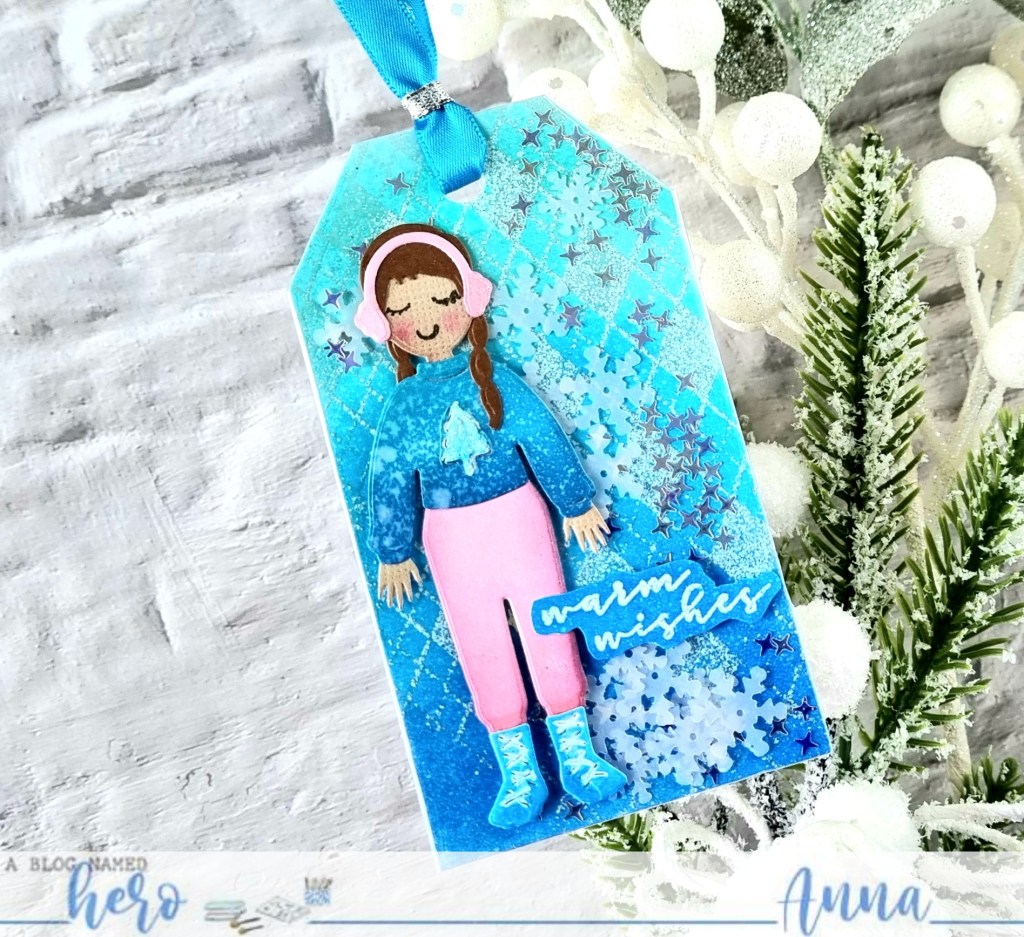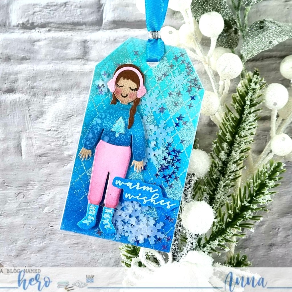 As for the cute girl, I used the Hero Lifestyles Forms and dressed her up with the Lifestyles Winter Accessories add-on. I stamped her face using Intens-ified black ink from the Hero Lifestyle faces stamp set. Her outfit is inkblended with same colors as the background except for the ear muff and pants, that was ink blended using Taffy Reactive ink. I used a sparkle pen to add more sparkle to her ear muffs and boots. I used a white gel pen to add laces to her boots and to color in the Christmas Tree design on her sweater before I added more sparkle and dimension with a Sparkle Clear Lacquer Pen. Then I used white embossing powder on an ink blended background for the “Warm Wishes” sentiment which came from the Christmas Holidays Stamp & Cut XL set.