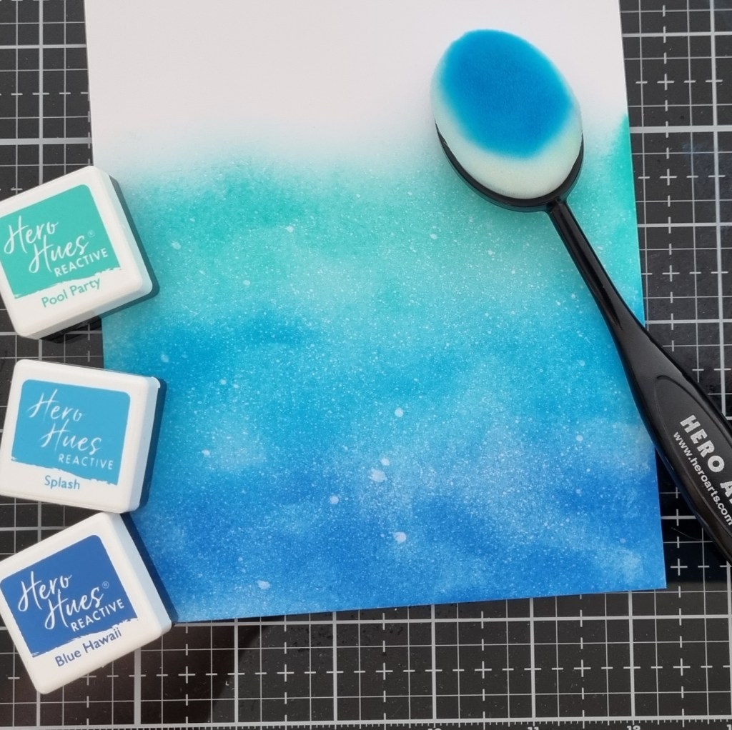 First I took a large piece of Dove white cardstock and created an ink-blended background with Hero Hues Reactive Ink. I started with Pool Party, then Splash and then Blue Hawaii. These colors are from the Hero Hues Sea Mini Ink cube collection. I plan to heat emboss on top of this background so I did not worry that the it looked a little splotchy. In fact, that was the effect I was going for!