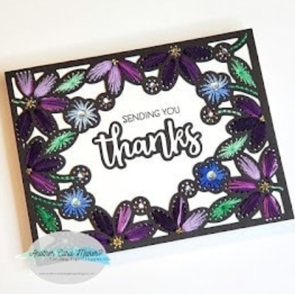For this card project, I used the Stitched Flowers dies from Spellbinders. I used to cross stitch a lot when I was still single and I have a TON of embroidery threads that I have just hoarded, So I pulled out a few colors of thread that best matched the color palette of Marie’s christmas card. I chose two shades of pink and green, light and dark shades.