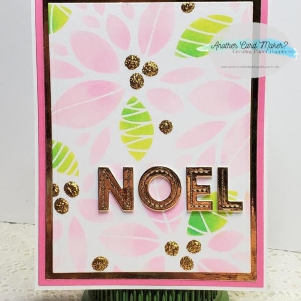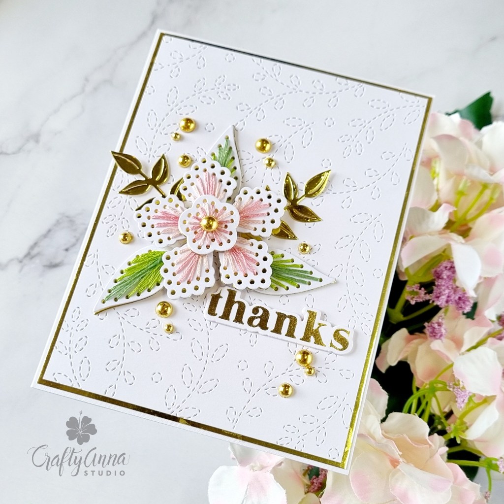 The sentiment “thanks” is hot foiled using the Spellbinders Glimmer Machine. The sentiment is from the Bold Glimmer Sentiment set also from Spellbinders.