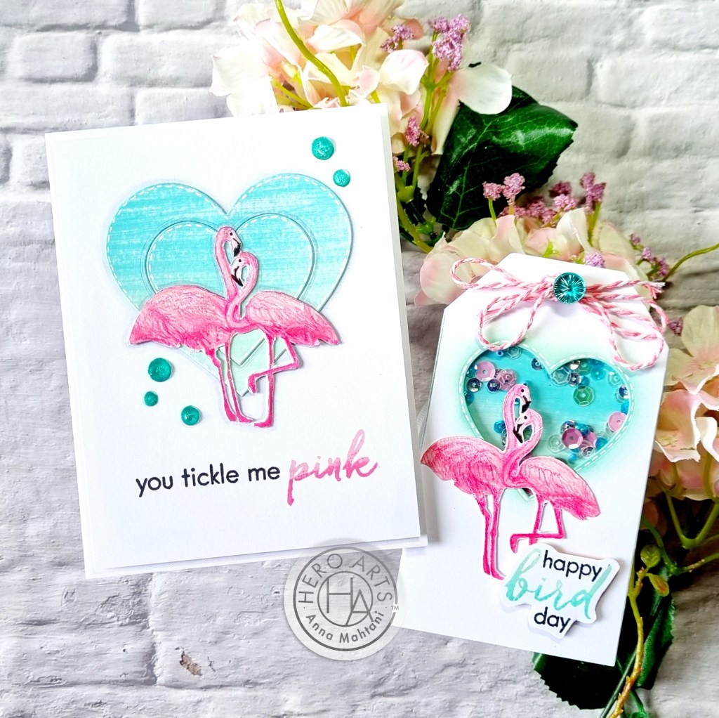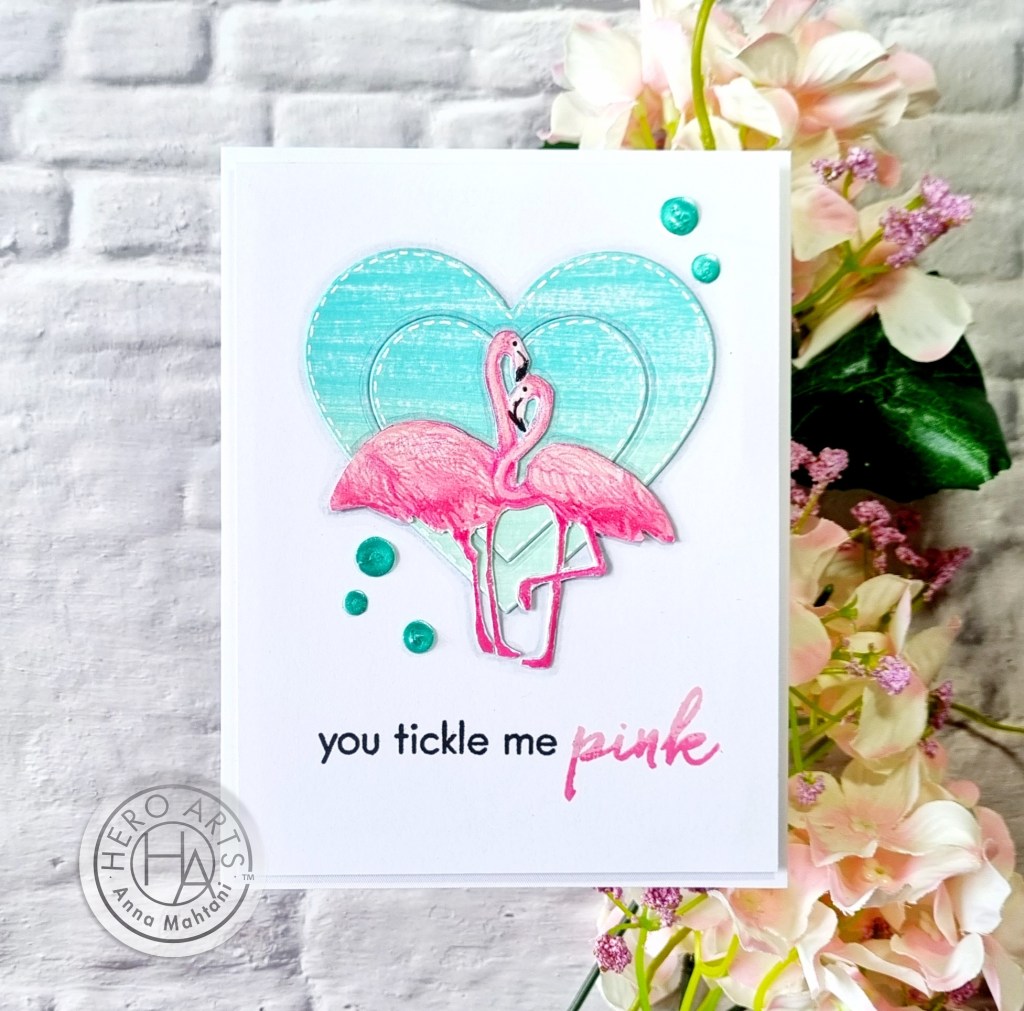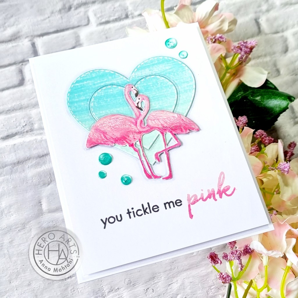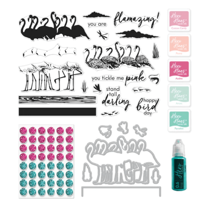 This month’s Hero Arts My Monthly kit is all about flamingos and the tropics! You get a stamp set featuring a color layering flock of flamingos and other supproting images, as well as coordinating frame cuts. The kit also comes with 5 mini Ink Cubes (Cotton Candy, Peony, Azalea, Arctic, Paradise), a pack of self-Adhesive Pink & Teal Gems and Teal Hero Pearls (0.6 oz).