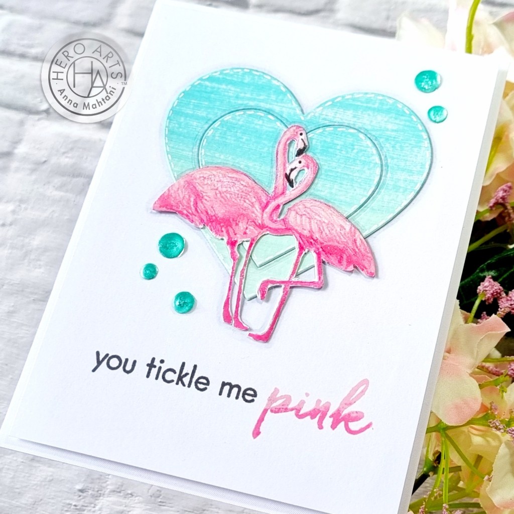 Then after stamping the sentiment, I added stitching details around the hearts with a white gel pen before adhering the pair of flamingos on top. I adhered the panel onto a 4.5″X5.5″ side folded notecard, then finished it off with dots of Hero Arts Pearls that also came in the kit.