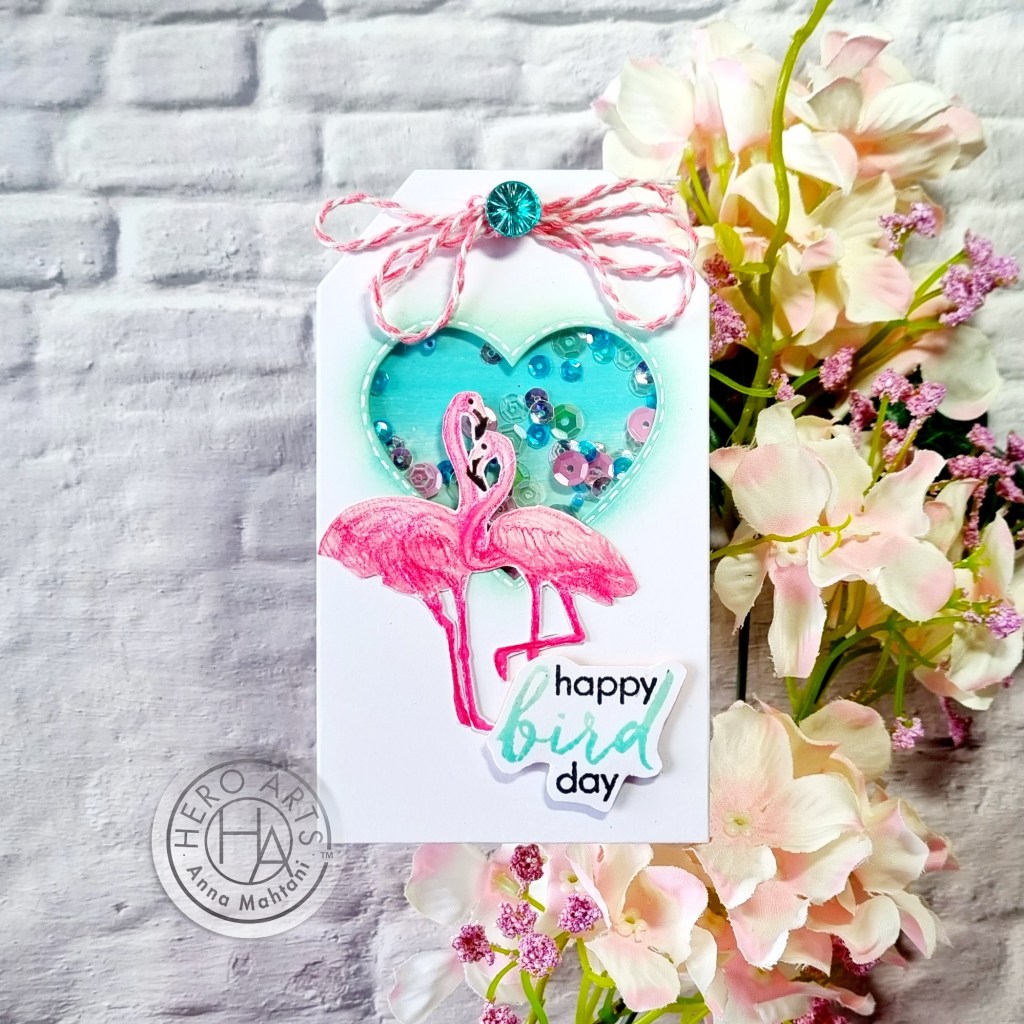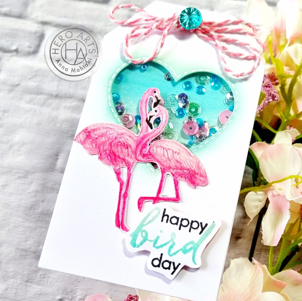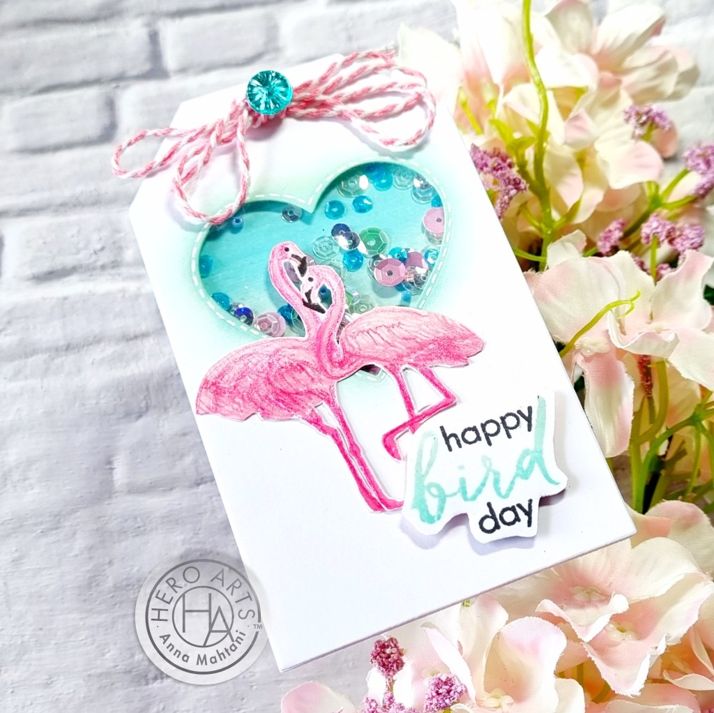 I then adhered the flamingo a little to the left of the heart window and added the sentiment “happy bird day” which I stamped and fussy cut out using the same technique as the card. To finish off the tag, I added pink and white bakers twine tied in a bow embellished with a teal gem that came in the kit.
