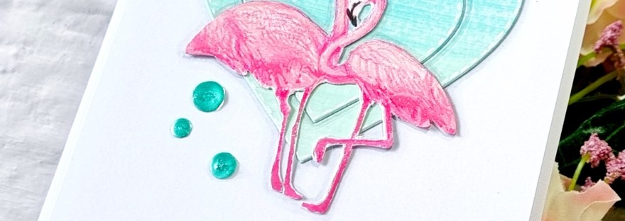 I just love the color layering flock of flamingos, they are so easy to line up and they fill up a card very nicely. For my project inspiration today, I will be doing something a little different. It all started when I made a rookie mistake in my stamping. I got some ink on my fingers and after stamping out the flamingos, I smeared ink on one side of the image. Ugh! I didnt want to have to repeat and waste the beautifully stamped image so I decided to fussy cut a pair out, the pair that were facing each other. I took some colored pencils and just darkened some areas to give the image more depth. I loved how it turned out so I fussy cut and colored another pair of flamingos!