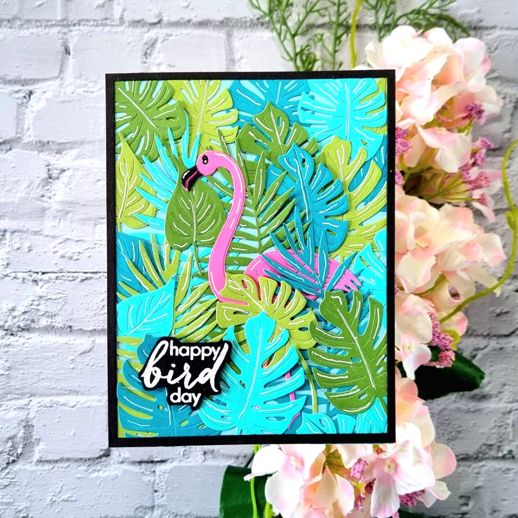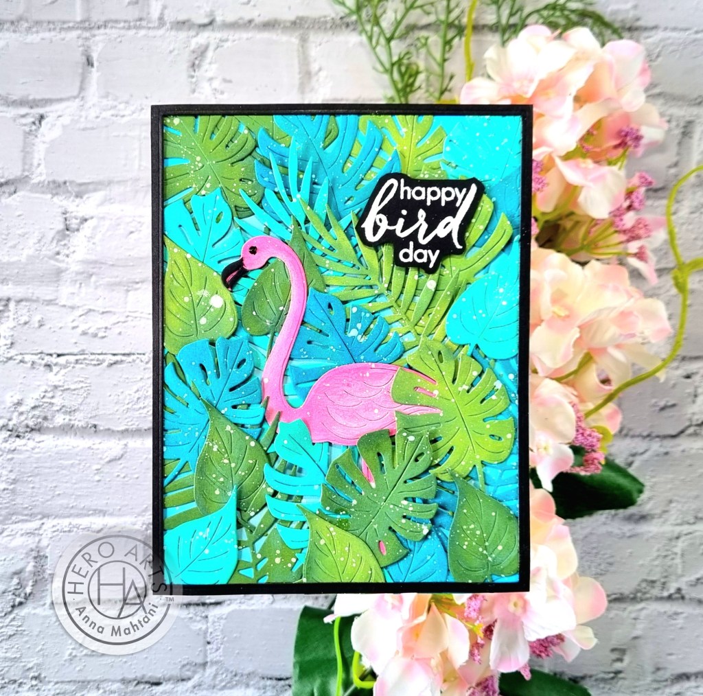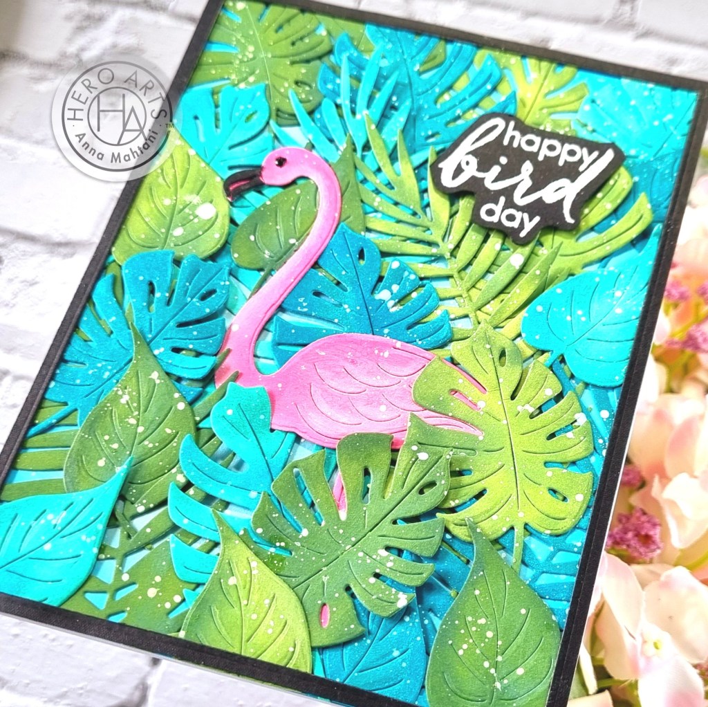 I’ll be using Hero Arts hero hues cardstock. For the leaves, I’ll be using Kiwi, Meadow, Paradise & Bermuda. For the background, Mist and for the flamingo, Peony. I’ll also be using distress oxide inks, Rustic Wilderness, Mowed Lawn.. Peacock Feathers and Mermaid Lagoon, Picked Raspberry and Kitsch Flamingo.