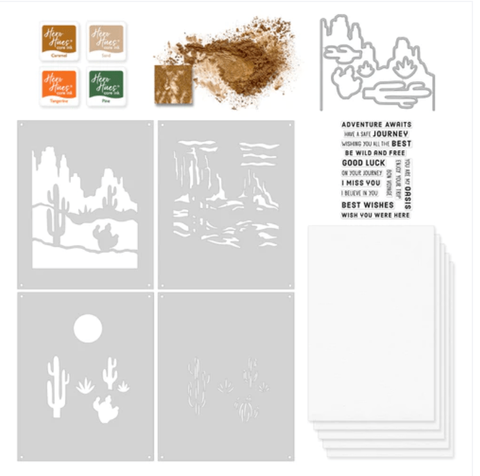 Hello friends! I’m so excited to show you the card I made using the My Monthly Hero August 2022 kit. I did something slightly different from what the kit was intended for – which is to create this gorgeous desert scene using stencils. The Hero Arts design team created so many permutations of this scene, mine will pale in comparison! Here is what the kit contains.
