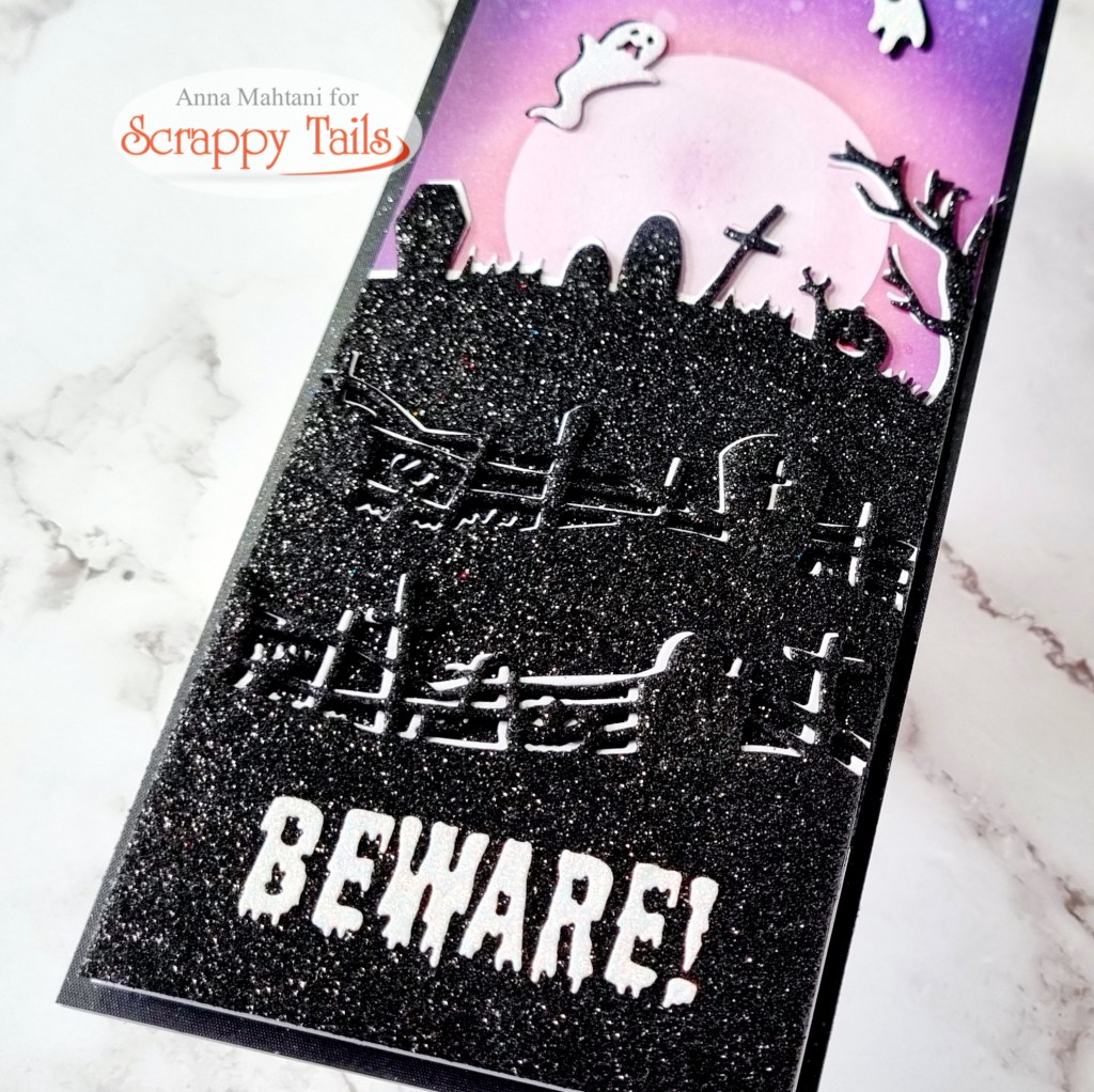 Next, I used the two dies from the Slimline Graveyard Border set, and die cut them out of black glitter cardstock. I also used the same dies and die cut them out of white fun foam. I adhered the white fun foam behind the die-cut graveyard border, offsetting it a little. This creates a white “shadow” which will make the layers stand out and will also look like the reflection of the moonlight on the graveyard.