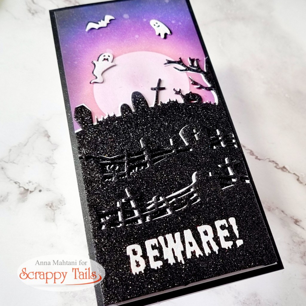 For the sentiment BEWARE and the two little ghosts and bat, I used the dies from the A7 Storefront Halloween Add-on die set. I die-cut them using white glitter cardstock and off set them with the left over glitter cardstock. This was really so much fun to make and I look forward to making more cards with the latest Scrappy Tails Harvest Blessings release!