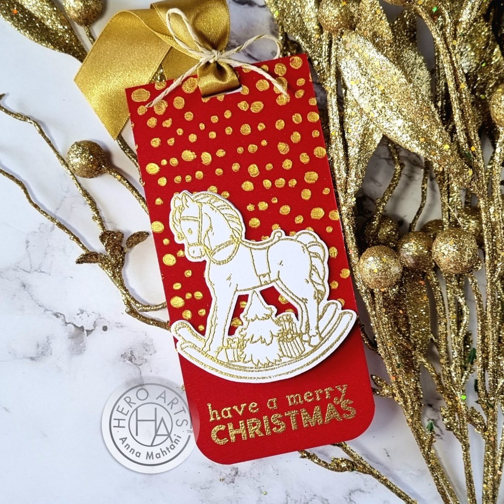 Once dried, I stamped and gold heat embossed the sentiment “have a merry christmas at the bottom of the tag and used a corner rounder to round out the edges.