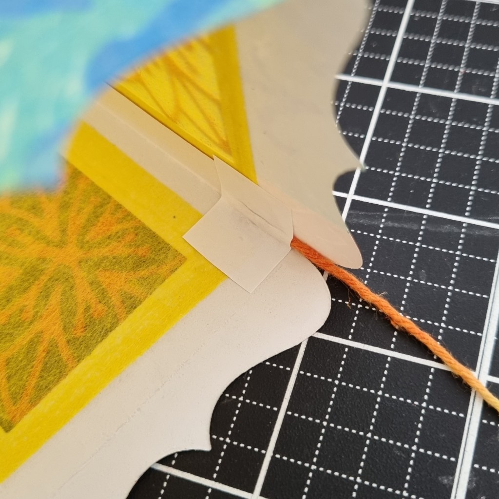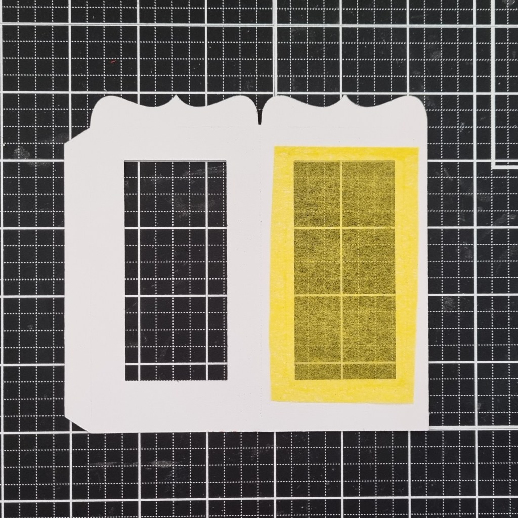 I die cut 2 pieces for the main body of the lantern. Then I added a yellow tissue at the back of each opening. This will allow light to show thru just in case I wanted to add mini string lights or fairy lights.