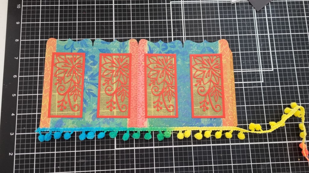 Then I adhered the panels together, lining it up on the tabs located on one side. Then i took some colorful pompom ribbon trim from my stash and adhered it to the bottom edge of the panels. Then added glue to the end tab to close it.