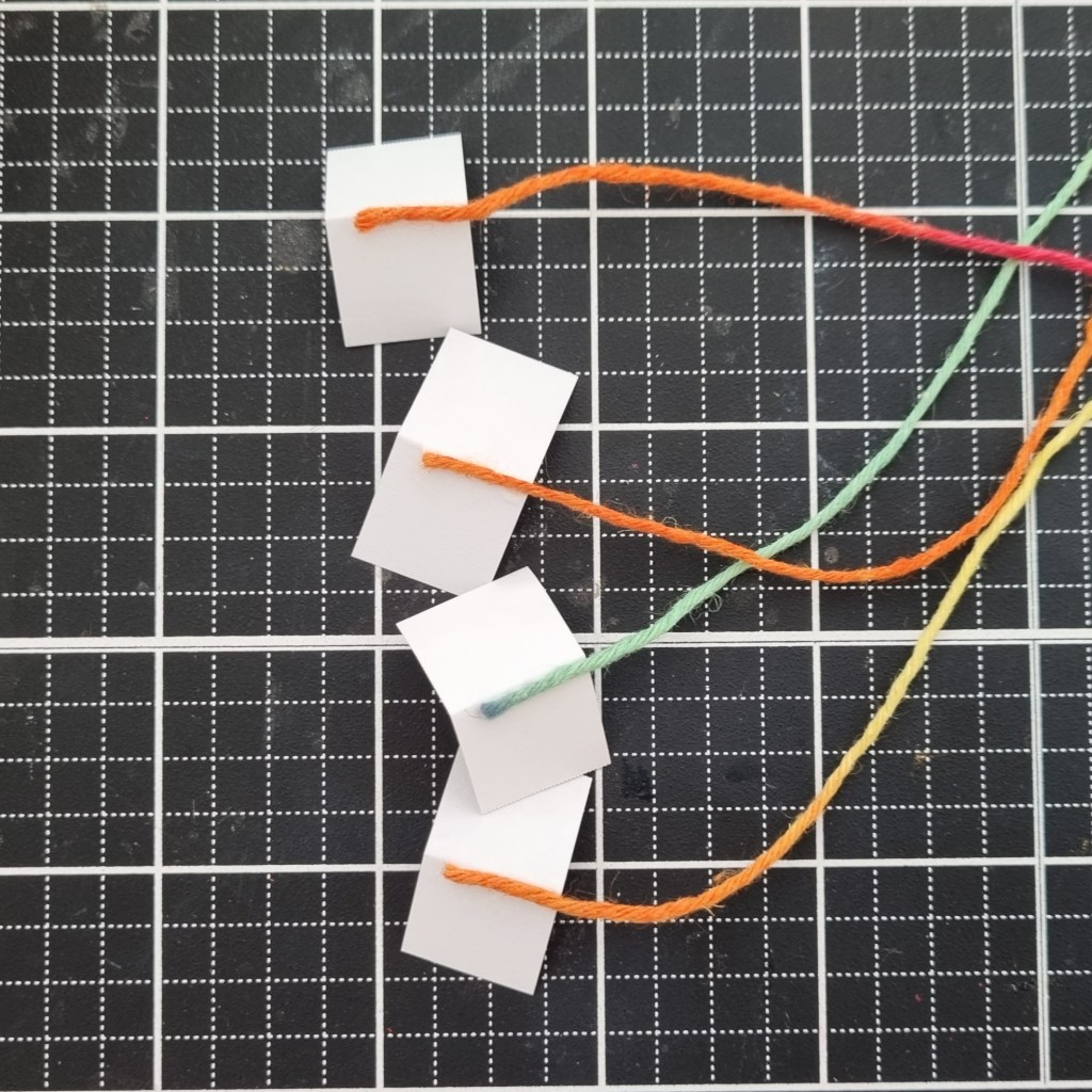 For attach the hanging the string that will become the hanging element, I cut four pieces of twine that are 12″ long. You can cut longer pieces as you require. Then I took pieces small pieces of paper cut to about 3/4″ square, folded it in half and glued the ends of the twine to the middle of the fold.
