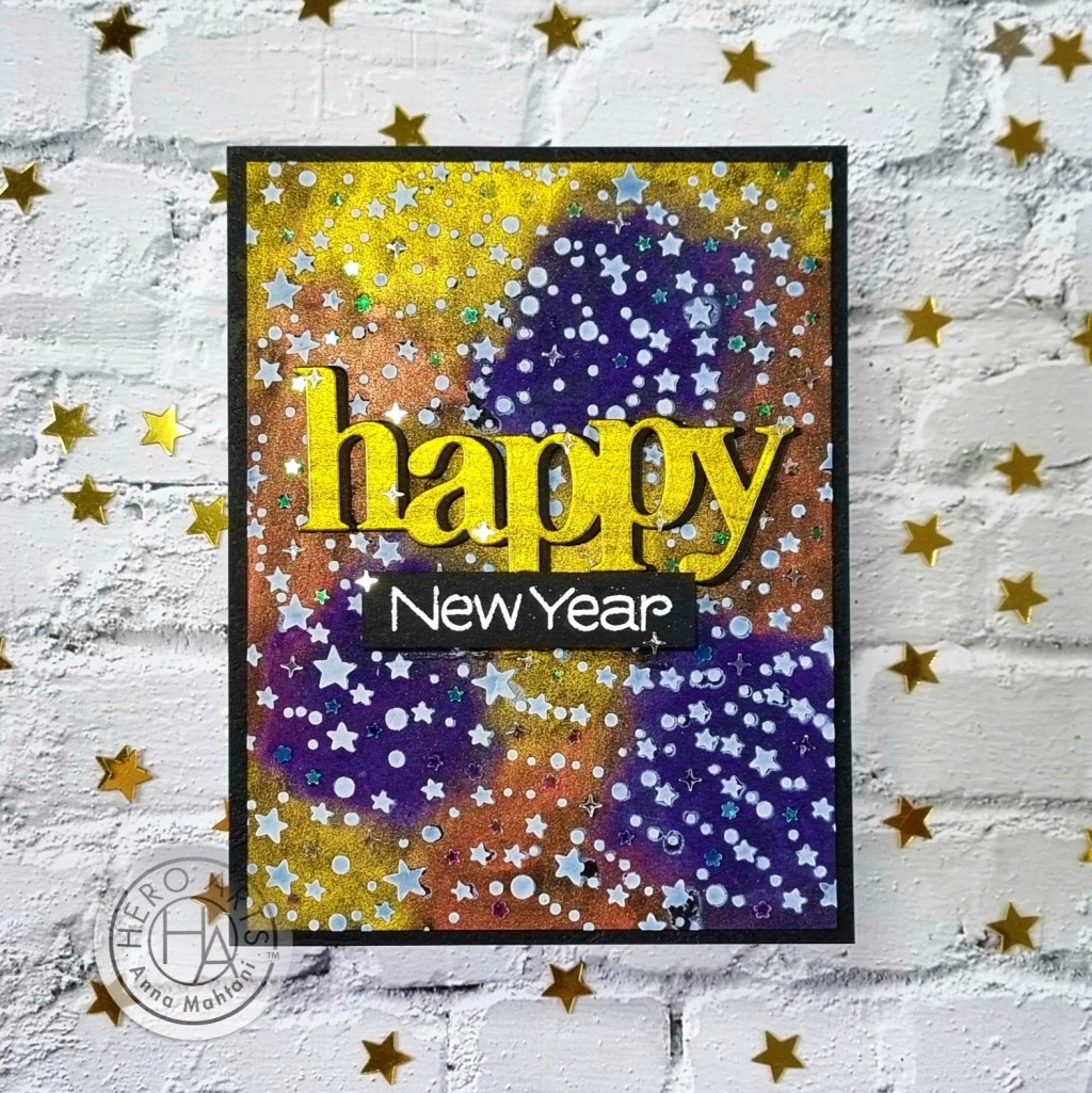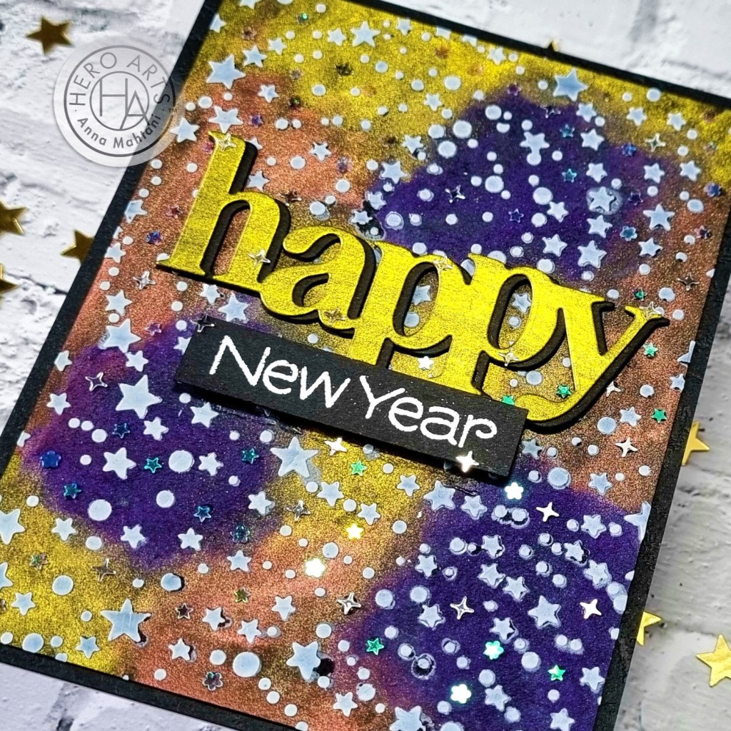 Next, I painted on some gold glimmer ink from Hero Arts on a scrap of black cardstock and die cut the word “Happy” from the Happy Thanks Stamp and Cut XL, also from Hero Arts. I also cut two extra from black cardstock and adhered it to the back, off setting a little. Then added the word “New Year”, white heat embossed on black cardstock. The sentiment is from Celebrate Everyday stamp set, one that I’ve also had in my stash for quite awhile.