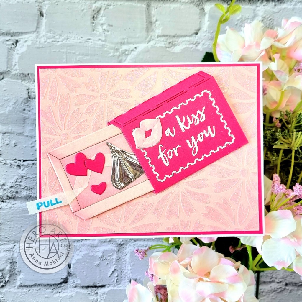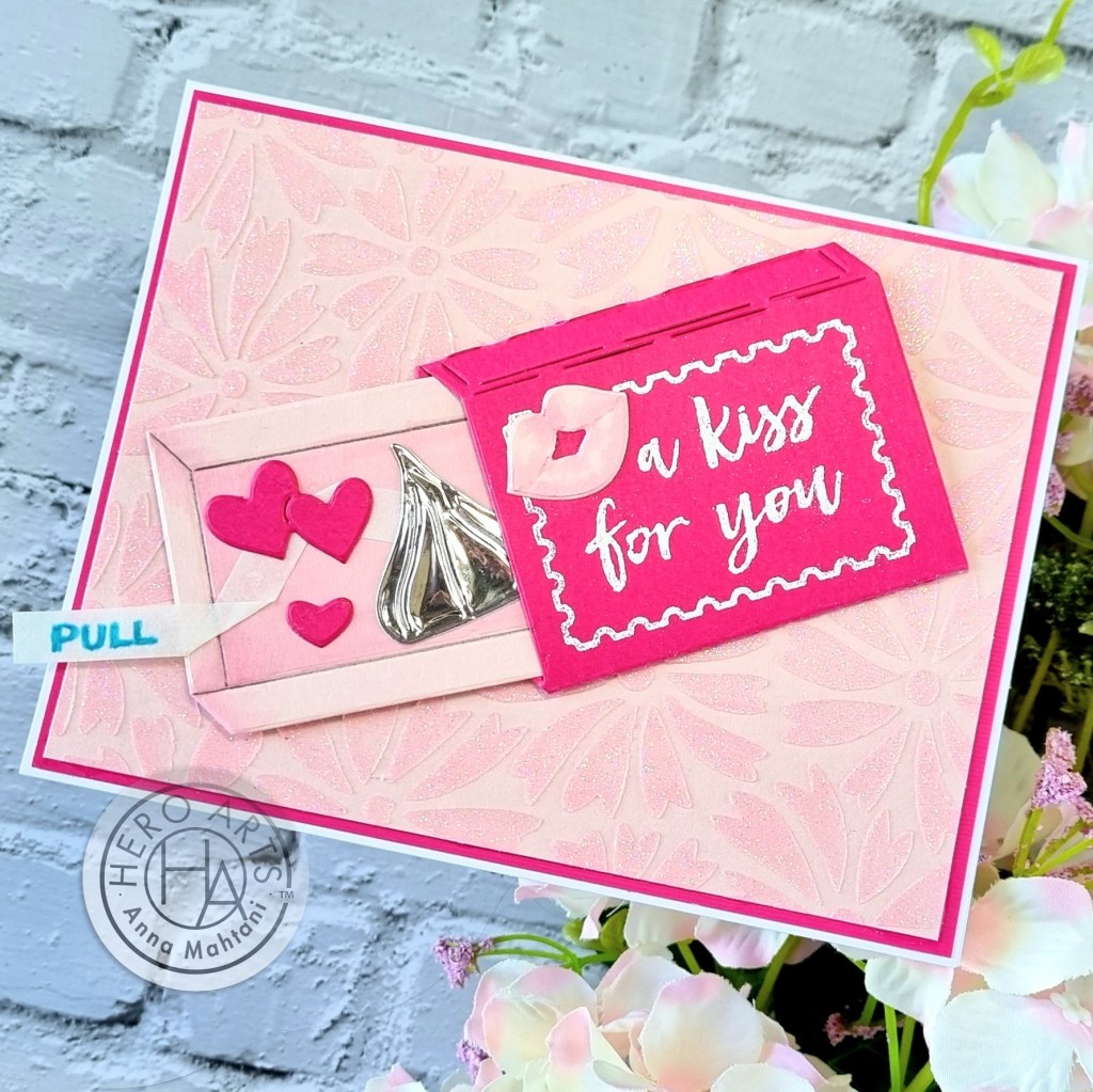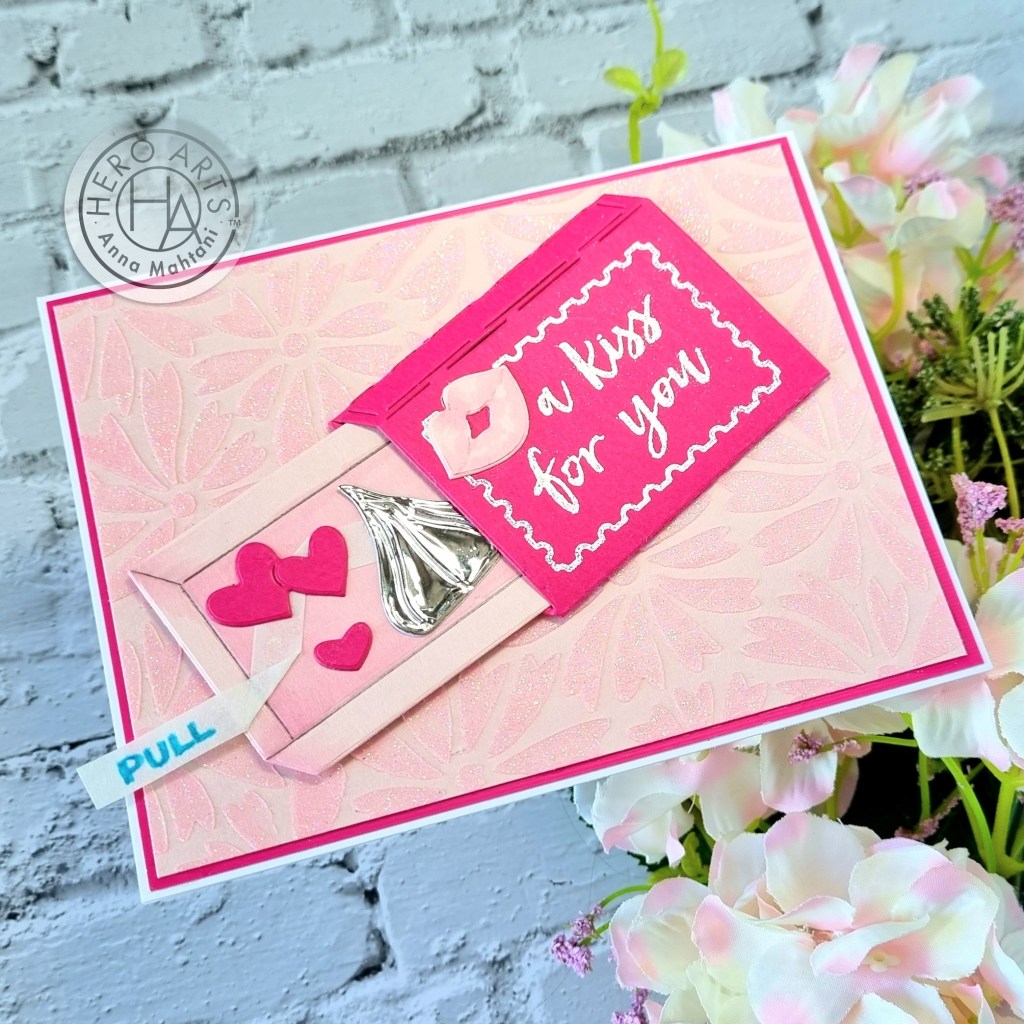 For my card inspiration today, I used mostly contents from the kit. The only I brought in a few items like the lovely Hero Arts Glitter paste to create the background and aluminum tape to cut out the chocolate kiss. The rest you may have in your stash already.