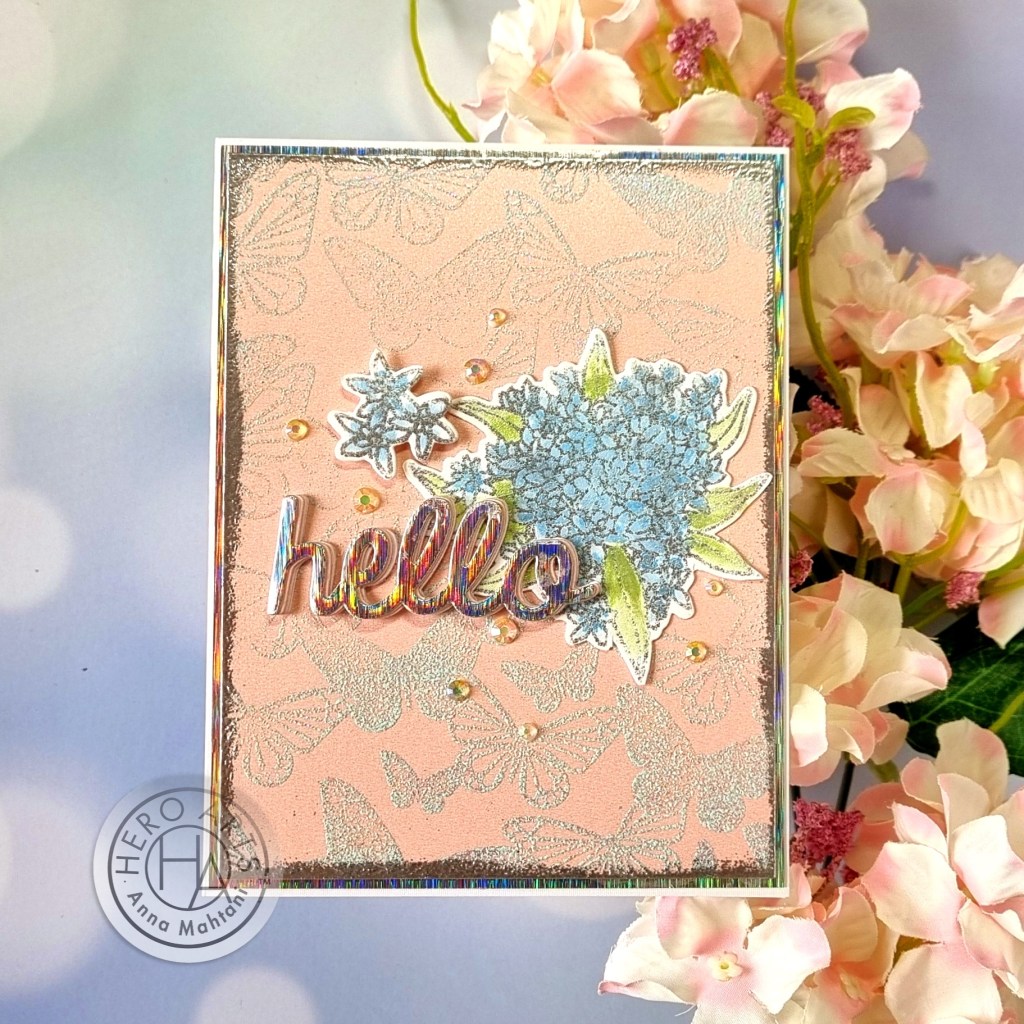 The sentiment, Hello, is from the Friend Words fancy die set diecut using holographic paper from my stash. I also used the same holographic paper for matting.