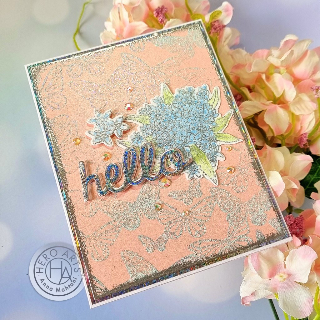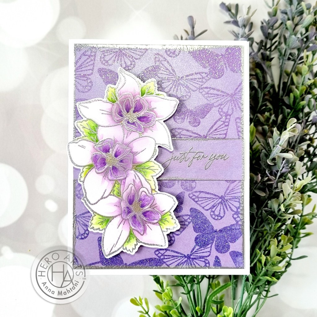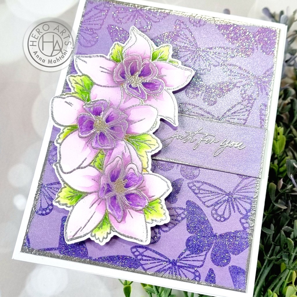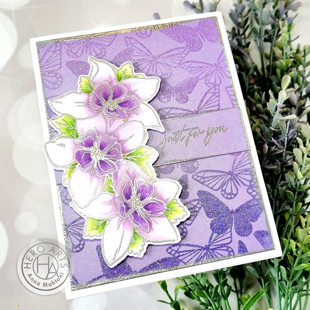 For the main image of the card, I stamped the flower cluster from the Wild Wisteria stamp & die set with embossing ink and heat embossed it using Silver embossing powder. I used the coordinating 4-pc stencil set to color in the details using the inks from the Floral & Nature Palette set of reactive inks. Then I die-cut them out using the coordinating die.