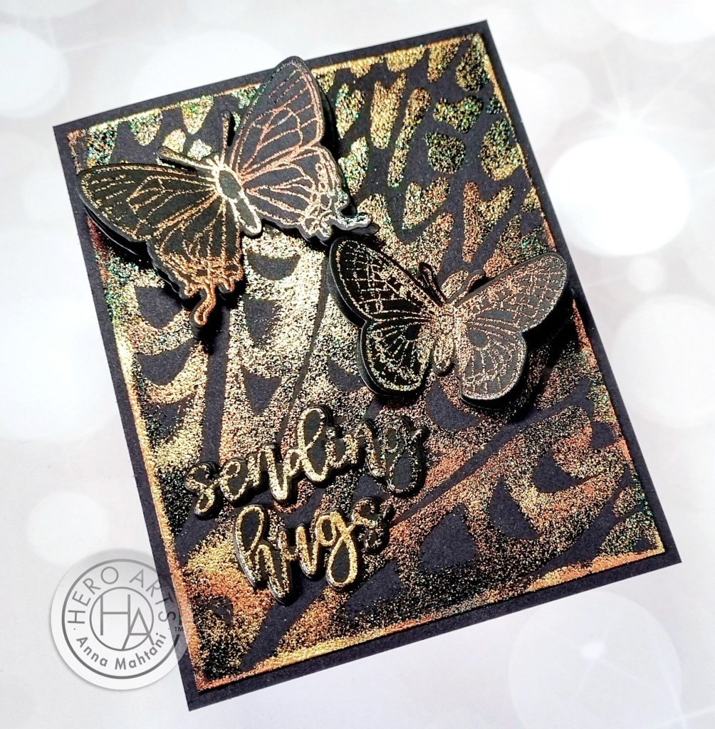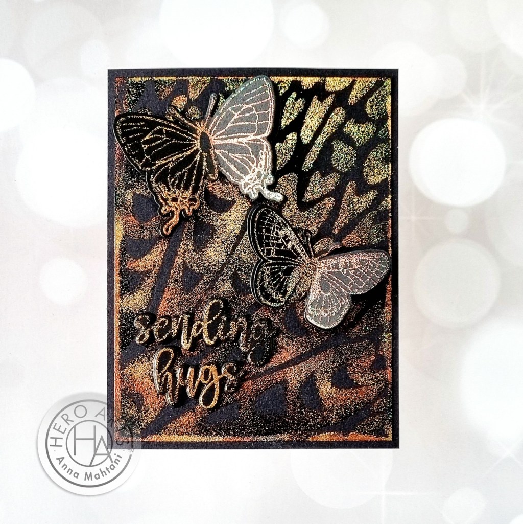 I adhered the panel on a black cardstock, then added the butterflies, just adding the glue to the bodies and lifting the wings to give it some dimension. The sentiment, Sending Hugs, is from the You’re Mine stamp & die bundle.